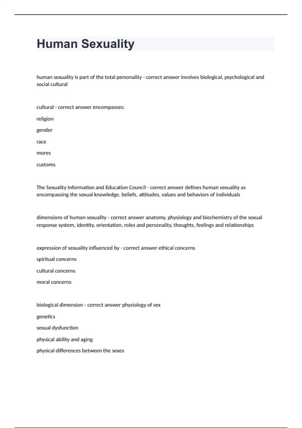 Human Sexualityhuman sexuality is part of the total personality - correct answer involves biological, psychological and social cultural cultural - correct answer encompasses: religion gender race mores customs The Sexuality Information and Education Council - correct answer defines human sexuality as encompassing the sexual knowledge, beliefs, attitudes, values and behaviors of individuals dimensions of human sexuality - correct answer anatomy, physiology and biochemistry of the sexual response system, identity, orientation, roles and personality, thoughts, feelings and relationships expression of sexuality influenced by - correct answer ethical concerns spiritual concerns cultural concerns moral concerns biological dimension - correct answer physiology of sex genetics sexual dysfunction physical ability and aging physical differences between the sexes
