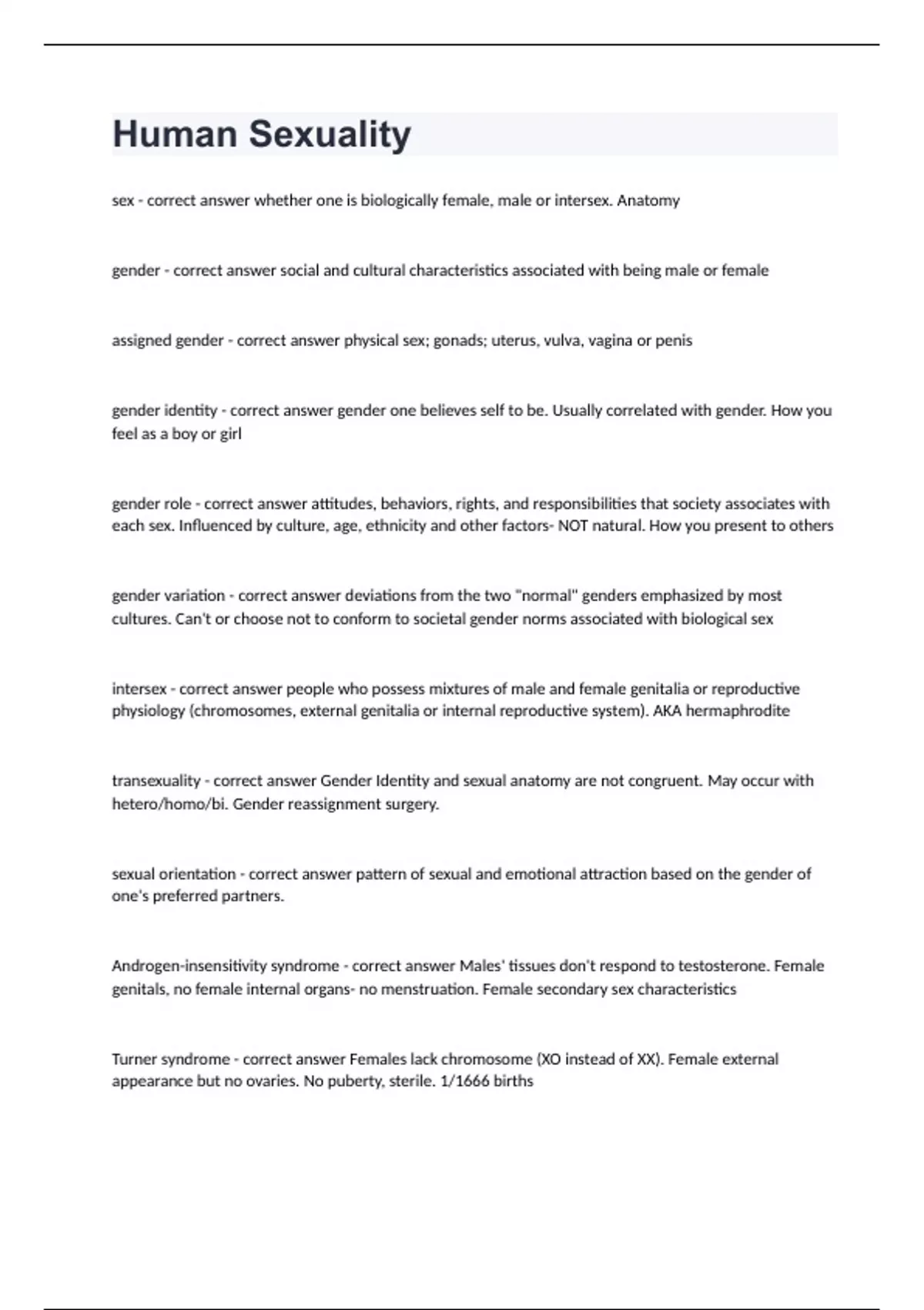Human Sexualitysex - correct answer whether one is biologically female, male or intersex. Anatomy gender - correct answer social and cultural characteristics associated with being male or female assigned gender - correct answer physical sex; gonads; uterus, vulva, vagina or penis gender identity - correct answer gender one believes self to be. Usually correlated with gender. How you feel as a boy or girl gender role - correct answer attitudes, behaviors, rights, and responsibilities that society associates with each sex. Influenced by culture, age, ethnicity and other factors- NOT natural. How you present to others gender variation - correct answer deviations from the two "normal" genders emphasized by most cultures. Can't or choose not to conform to societal gender norms associated with biological sex intersex - correct answer people who possess mixtures of male and female genitalia or reproductive physiology (chromosomes, external genitalia or internal reproductive system). AKA hermaphrodite transexuality - correct answer Gender Identity and sexual anatomy are not congruent. May occur with hetero/homo/bi. Gender reassignment surgery. sexual orientation - correct answer pattern of sexual and emotional attraction based on the gender of one's preferred partners.