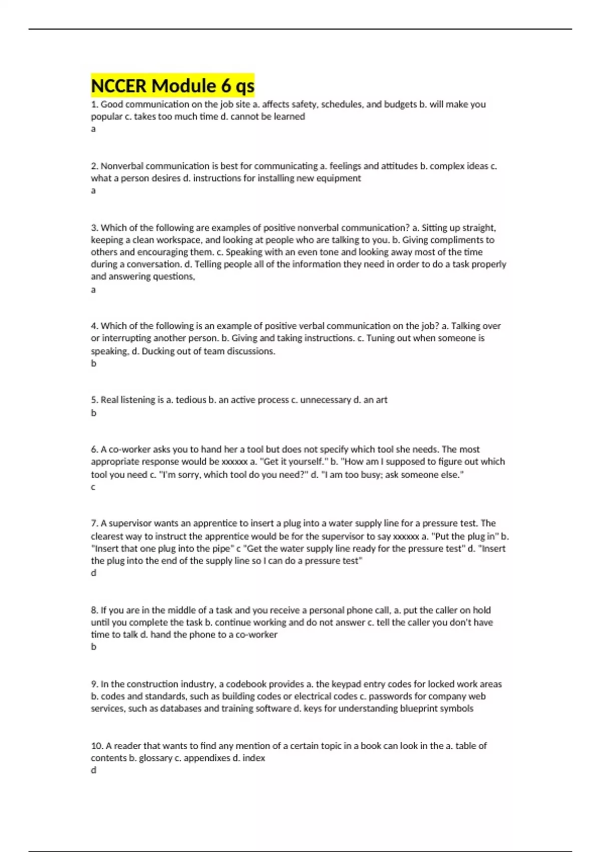 NCCER Module 6 qs 1. Good communication on the job site a. affects safety, schedules, and budgets b. will make you popular c. takes too much time d. cannot be learned a 2. Nonverbal communication is best for communicating a. feelings and attitudes b. complex ideas c. what a person desires d. instructions for installing new equipment a 3. Which of the following are examples of positive nonverbal communication? a. Sitting up straight, keeping a clean workspace, and looking at people who are talking to you. b. Giving compliments to others and encouraging them. c. Speaking with an even tone and looking away most of the time during a conversation. d. Telling people all of the information they need in order to do a task properly and answering questions, a 4. Which of the following is an example of positive verbal communication on the job? a. Talking over or interrupting another person. b. Giving and taking instructions. c. Tuning out when someone is speaking, d. Ducking out of team discussions. b 5. Real listening is a. tedious b. an active process c. unnecessary d. an art b 6. A co-worker asks you to hand her a tool but does not specify which tool she needs. The most appropriate response would be xxxxxx a. "Get it yourself." b. "How am I supposed to figure out which tool you need c. "I'm sorry, which tool do you need?" d. "I am too busy; ask someone else." c 7. A supervisor wants an apprentice to insert a plug into a water supply line for a pressure test. The clearest way to instruct the apprentice would be for the supervisor to say xxxxxx a. "Put the plug in" b. "Insert that one plug into the pipe" c "Get the water supply line ready for the pressure test" d. "Insert the plug into the end of the supply line so I can do a pressure test" d 8. If you are in the middle of a task and you receive a personal phone call, a. put the caller on hold until you complete the task b. continue working and do not answer c. tell the caller you don't have time to talk d. hand the phone to a co-worker b 9. In the construction industry, a codebook provides a. the keypad entry codes for locked work areas b. codes and standards, such as building codes or electrical codes c. passwords for company web services, such as databases and training software d. keys for understanding blueprint symbols