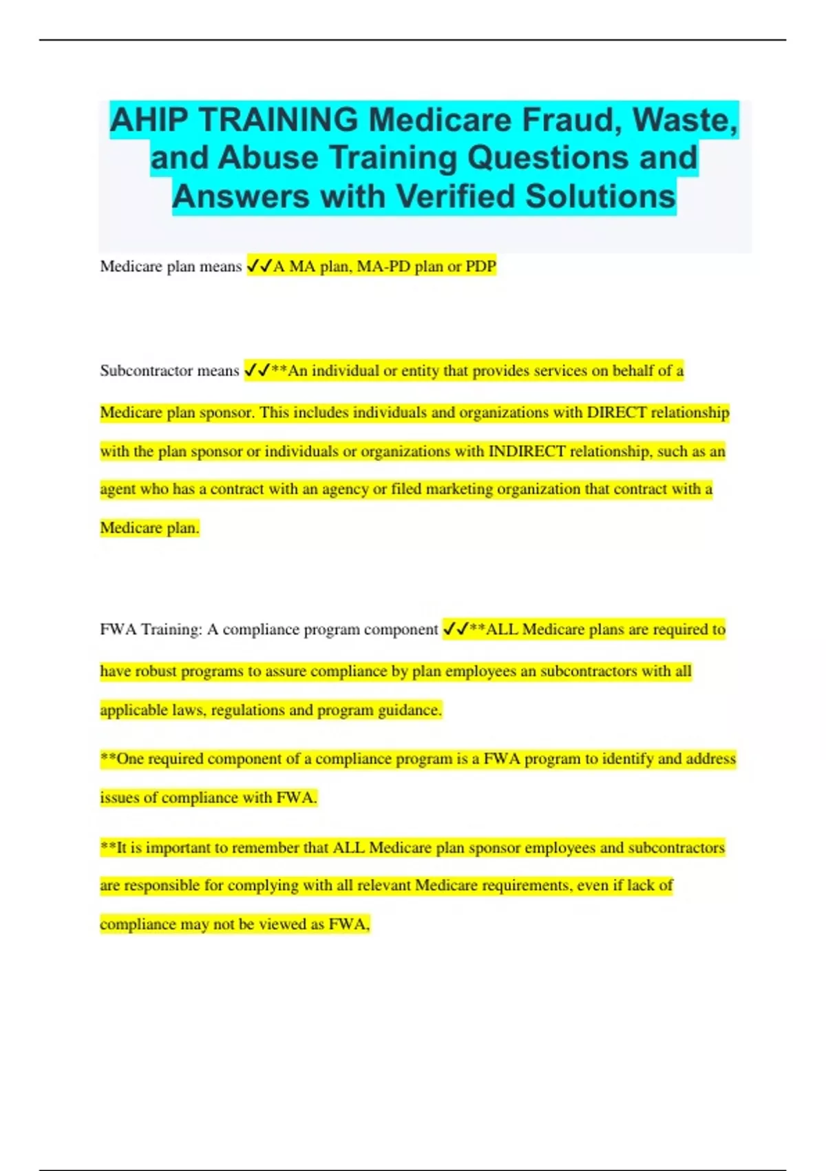 AHIP TRAINING Medicare Fraud, Waste, and Abuse Training Questions and Answers with Verified Solutions