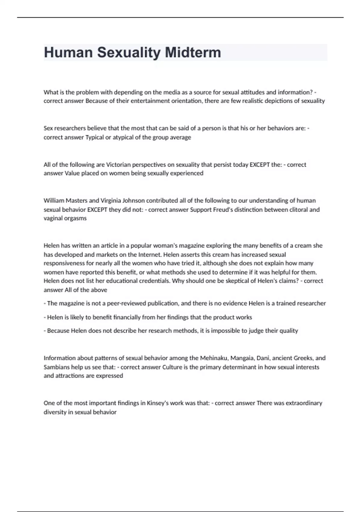 Human Sexuality MidtermWhat is the problem with depending on the media as a source for sexual attitudes and information? - correct answer Because of their entertainment orientation, there are few realistic depictions of sexuality Sex researchers believe that the most that can be said of a person is that his or her behaviors are: - correct answer Typical or atypical of the group average All of the following are Victorian perspectives on sexuality that persist today EXCEPT the: - correct answer Value placed on women being sexually experienced William Masters and Virginia Johnson contributed all of the following to our understanding of human sexual behavior EXCEPT they did not: - correct answer Support Freud's distinction between clitoral and vaginal orgasms Helen has written an article in a popular woman's magazine exploring the many benefits of a cream she has developed and markets on the Internet. Helen asserts this cream has increased sexual responsiveness for nearly all the women who have tried it, although she does not explain how many women have reported this benefit, or what methods she used to determine if it was helpful for them. Helen does not list her educational credentials. Why should one be skeptical of Helen's claims? - correct answer All of the above - The magazine is not a peer-reviewed publication, and there is no evidence Helen is a trained researcher - Helen is likely to benefit financially from her findings that the product works - Because Helen does not describe her research methods, it is impossible to judge their quality Information about patterns of sexual behavior among the Mehinaku, Mangaia, Dani, ancient Greeks, and Sambians help us see that: - correct answer Culture is the primary determinant in how sexual interests and attractions are expressed One of the most important findings in Kinsey's work was that: - correct answer There was extraordinary diversity in sexual behavior