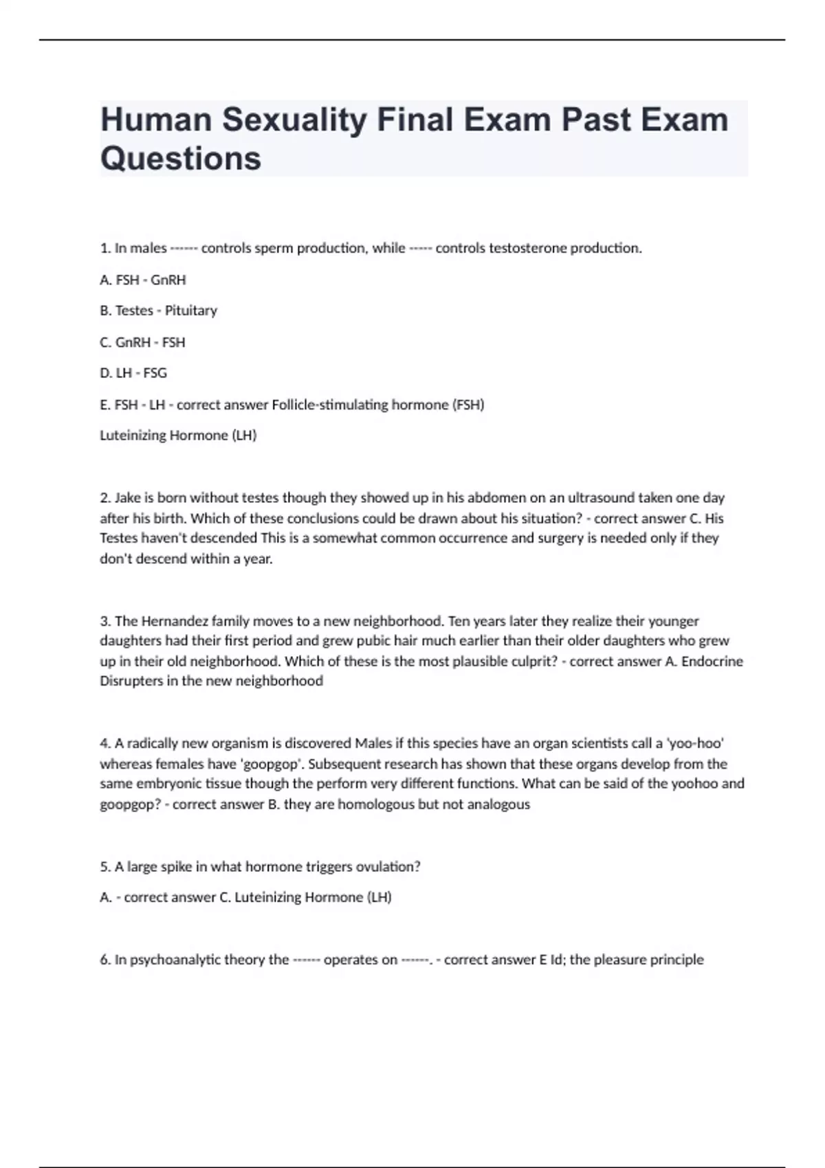 Human Sexuality Final Exam Past Exam Questions1. In males ------ controls sperm production, while ----- controls testosterone production. A. FSH - GnRH B. Testes - Pituitary C. GnRH - FSH D. LH - FSG E. FSH - LH - correct answer Follicle-stimulating hormone (FSH) Luteinizing Hormone (LH) 2. Jake is born without testes though they showed up in his abdomen on an ultrasound taken one day after his birth. Which of these conclusions could be drawn about his situation? - correct answer C. His Testes haven't descended This is a somewhat common occurrence and surgery is needed only if they don't descend within a year. 3. The Hernandez family moves to a new neighborhood. Ten years later they realize their younger daughters had their first period and grew pubic hair much earlier than their older daughters who grew up in their old neighborhood. Which of these is the most plausible culprit? - correct answer A. Endocrine Disrupters in the new neighborhood 4. A radically new organism is discovered Males if this species have an organ scientists call a 'yoo-hoo' whereas females have 'goopgop'. Subsequent research has shown that these organs develop from the same embryonic tissue though the perform very different functions. What can be said of the yoohoo and goopgop? - correct answer B. they are homologous but not analogous 5. A large spike in what hormone triggers ovulation? A. - correct answer C. Luteinizing Hormone (LH) 6. In psychoanalytic theory the ------ operates on ------. - correct answer E Id; the pleasure principle