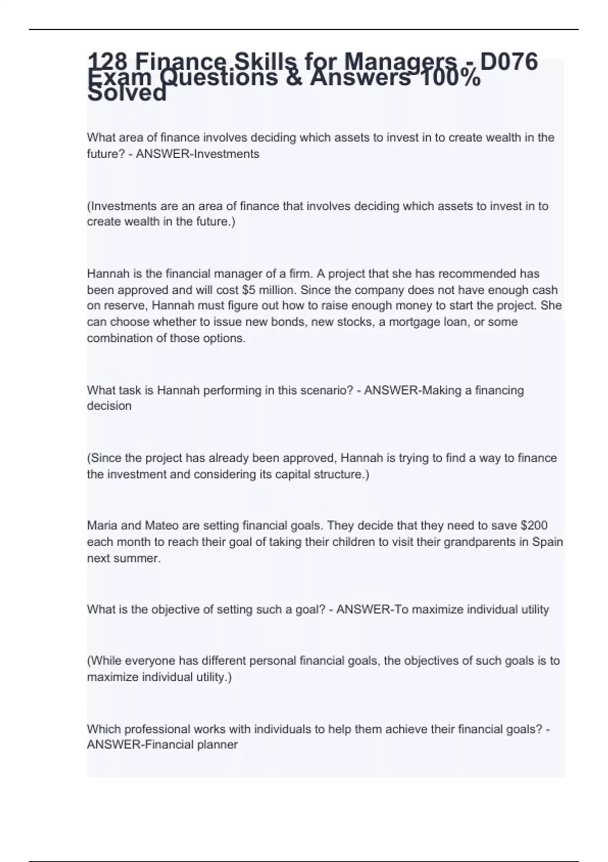 What area of finance involves deciding which assets to invest in to create wealth in the future? - ANSWER-Investments (Investments are an area of finance that involves deciding which assets to invest in to create wealth in the future.) Hannah is the financial manager of a firm. A project that she has recommended has been approved and will cost $5 million. Since the company does not have enough cash on reserve, Hannah must figure out how to raise enough money to start the project. She can choose whether to issue new bonds, new stocks, a mortgage loan, or some combination of those options. What task is Hannah performing in this scenario? - ANSWER-Making a financing decision (Since the project has already been approved, Hannah is trying to find a way to finance the investment and considering its capital structure.) Maria and Mateo are setting financial goals. They decide that they need to save $200 each month to reach their goal of taking their children to visit their grandparents in Spain next summer. What is the objective of setting such a goal? - ANSWER-To maximize individual utility (While everyone has different personal financial goals, the objectives of such goals is to maximize individual utility.)