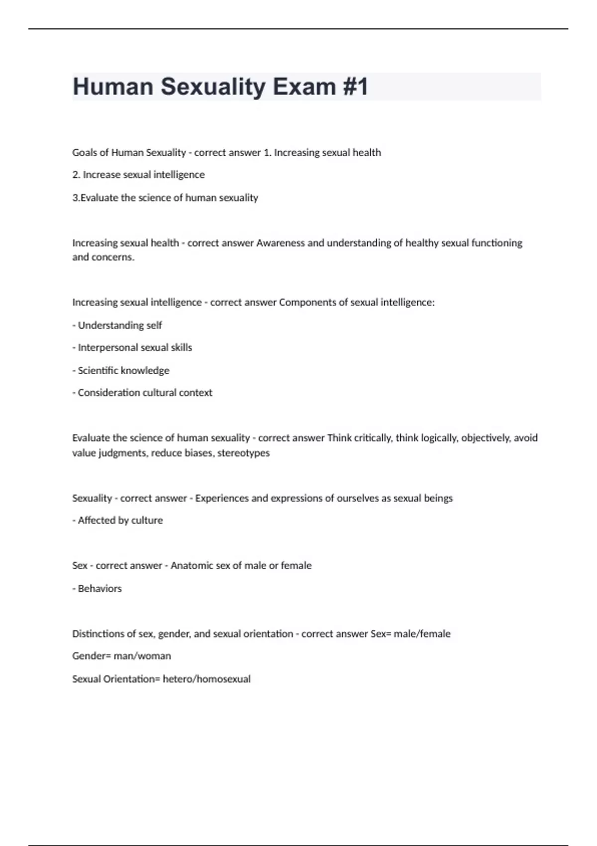 Human Sexuality Exam #1Goals of Human Sexuality - correct answer 1. Increasing sexual health 2. Increase sexual intelligence 3.Evaluate the science of human sexuality Increasing sexual health - correct answer Awareness and understanding of healthy sexual functioning and concerns. Increasing sexual intelligence - correct answer Components of sexual intelligence: - Understanding self - Interpersonal sexual skills - Scientific knowledge - Consideration cultural context Evaluate the science of human sexuality - correct answer Think critically, think logically, objectively, avoid value judgments, reduce biases, stereotypes Sexuality - correct answer - Experiences and expressions of ourselves as sexual beings - Affected by culture Sex - correct answer - Anatomic sex of male or female - Behaviors Distinctions of sex, gender, and sexual orientation - correct answer Sex= male/female Gender= man/woman Sexual Orientation= hetero/homosexual
