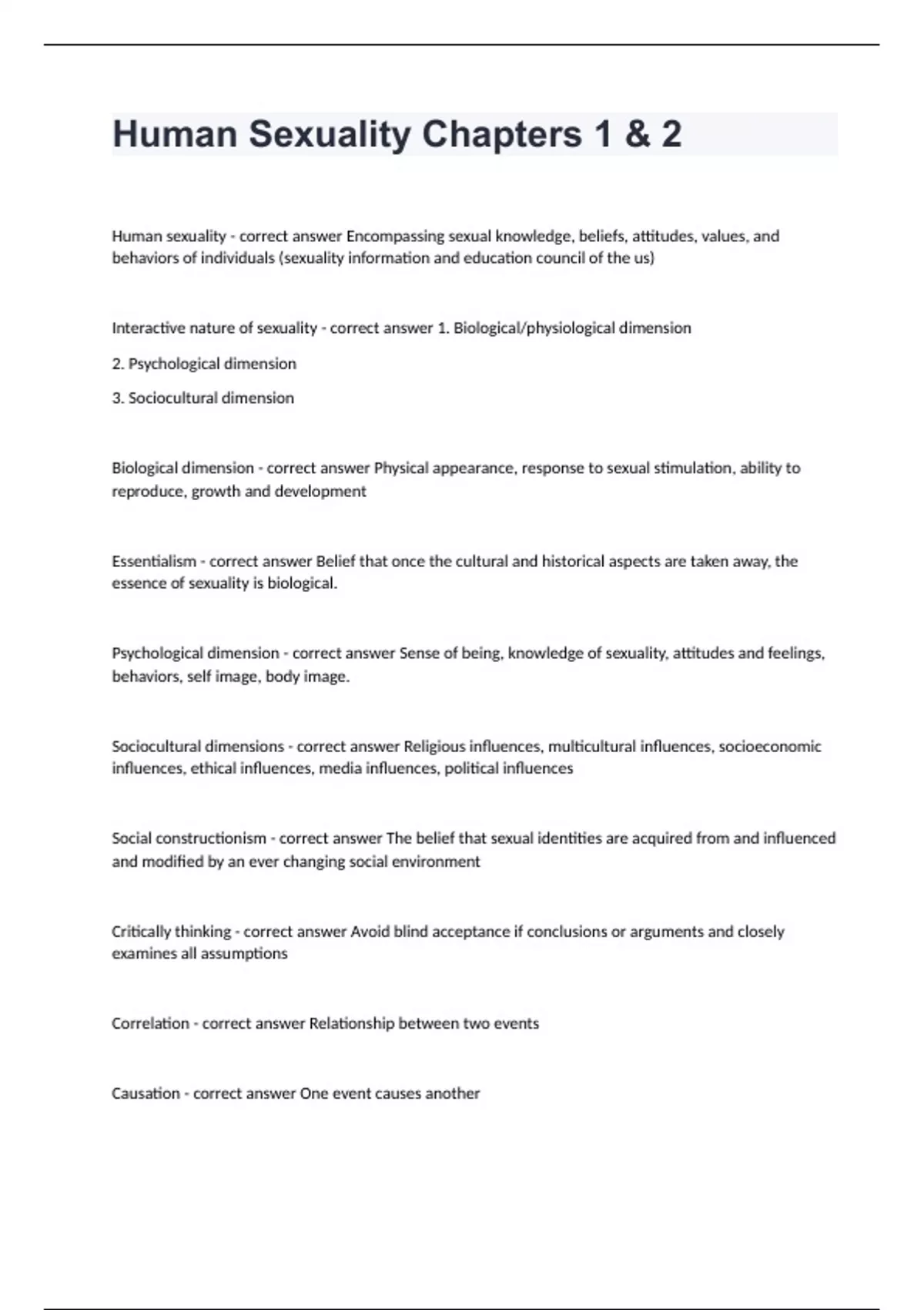 Human Sexuality Chapters 1 & 2Human sexuality - correct answer Encompassing sexual knowledge, beliefs, attitudes, values, and behaviors of individuals (sexuality information and education council of the us) Interactive nature of sexuality - correct answer 1. Biological/physiological dimension 2. Psychological dimension 3. Sociocultural dimension Biological dimension - correct answer Physical appearance, response to sexual stimulation, ability to reproduce, growth and development Essentialism - correct answer Belief that once the cultural and historical aspects are taken away, the essence of sexuality is biological. Psychological dimension - correct answer Sense of being, knowledge of sexuality, attitudes and feelings, behaviors, self image, body image. Sociocultural dimensions - correct answer Religious influences, multicultural influences, socioeconomic influences, ethical influences, media influences, political influences Social constructionism - correct answer The belief that sexual identities are acquired from and influenced and modified by an ever changing social environment Critically thinking - correct answer Avoid blind acceptance if conclusions or arguments and closely examines all assumptions Correlation - correct answer Relationship between two events