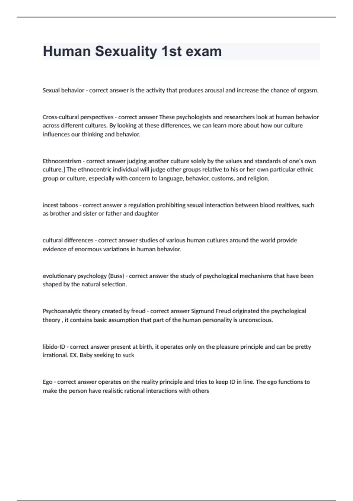 Human Sexuality 1st examSexual behavior - correct answer is the activity that produces arousal and increase the chance of orgasm. Cross-cultural perspectives - correct answer These psychologists and researchers look at human behavior across different cultures. By looking at these differences, we can learn more about how our culture influences our thinking and behavior. Ethnocentrism - correct answer judging another culture solely by the values and standards of one's own culture.] The ethnocentric individual will judge other groups relative to his or her own particular ethnic group or culture, especially with concern to language, behavior, customs, and religion. incest taboos - correct answer a regulation prohibiting sexual interaction between blood realtives, such as brother and sister or father and daughter cultural differences - correct answer studies of various human cutlures around the world provide evidence of enormous variations in human behavior. evolutionary psychology (Buss) - correct answer the study of psychological mechanisms that have been shaped by the natural selection. Psychoanalytic theory created by freud - correct answer Sigmund Freud originated the psychological theory , it contains basic assumption that part of the human personality is unconscious. libido-ID - correct answer present at birth, it operates only on the pleasure principle and can be pretty irrational. EX. Baby seeking to suck Ego - correct answer operates on the reality principle and tries to keep ID in line. The ego functions to make the person have realistic rational interactions with others