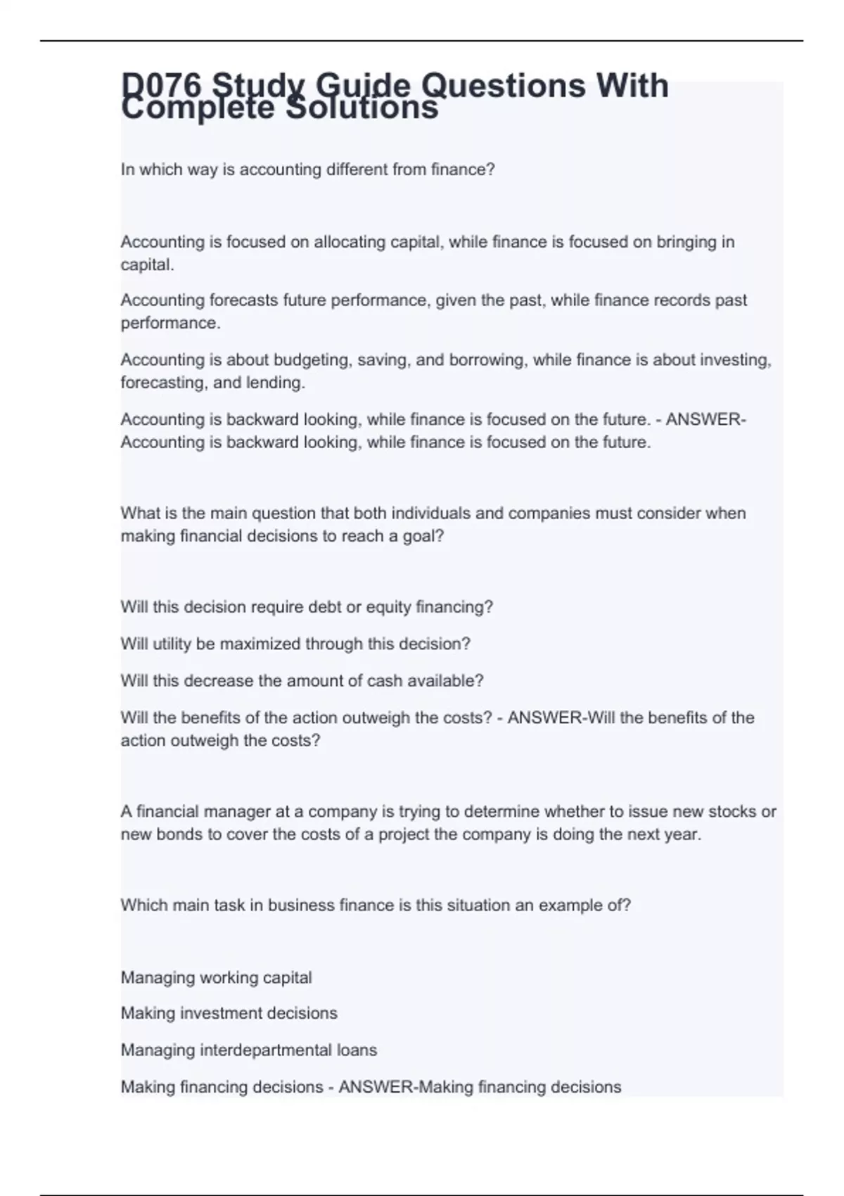 In which way is accounting different from finance? Accounting is focused on allocating capital, while finance is focused on bringing in capital. Accounting forecasts future performance, given the past, while finance records past performance. Accounting is about budgeting, saving, and borrowing, while finance is about investing, forecasting, and lending. Accounting is backward looking, while finance is focused on the future. - ANSWER-Accounting is backward looking, while finance is focused on the future. What is the main question that both individuals and companies must consider when making financial decisions to reach a goal? Will this decision require debt or equity financing? Will utility be maximized through this decision? Will this decrease the amount of cash available? Will the benefits of the action outweigh the costs? - ANSWER-Will the benefits of the action outweigh the costs? A financial manager at a company is trying to determine whether to issue new stocks or new bonds to cover the costs of a project the company is doing the next year. Which main task in business finance is this situation an example of? Managing working capital Making investment decisions Managing interdepartmental loans Making financing decisions - ANSWER-Making financing decisions
