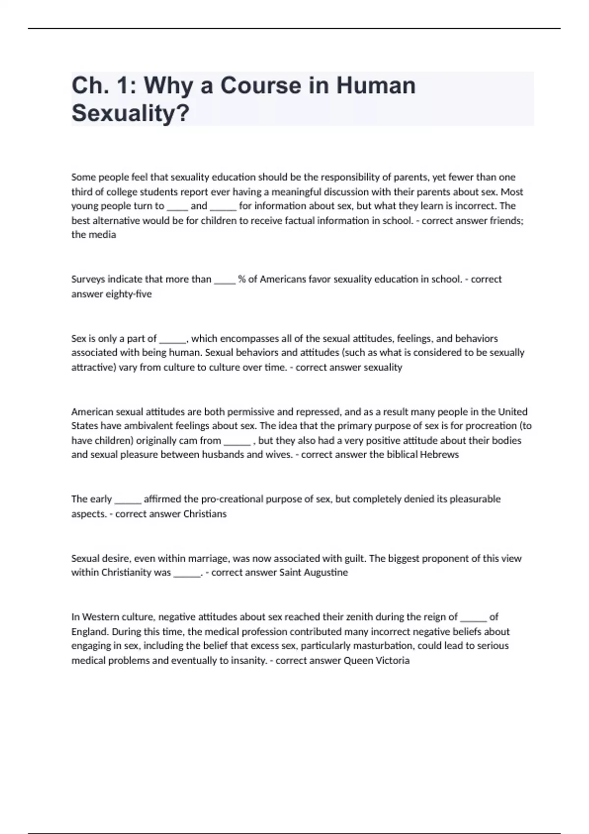 Ch. 1: Why a Course in Human Sexuality?Some people feel that sexuality education should be the responsibility of parents, yet fewer than one third of college students report ever having a meaningful discussion with their parents about sex. Most young people turn to ____ and _____ for information about sex, but what they learn is incorrect. The best alternative would be for children to receive factual information in school. - correct answer friends; the media Surveys indicate that more than ____ % of Americans favor sexuality education in school. - correct answer eighty-five Sex is only a part of _____, which encompasses all of the sexual attitudes, feelings, and behaviors associated with being human. Sexual behaviors and attitudes (such as what is considered to be sexually attractive) vary from culture to culture over time. - correct answer sexuality American sexual attitudes are both permissive and repressed, and as a result many people in the United States have ambivalent feelings about sex. The idea that the primary purpose of sex is for procreation (to have children) originally cam from _____ , but they also had a very positive attitude about their bodies and sexual pleasure between husbands and wives. - correct answer the biblical Hebrews The early _____ affirmed the pro-creational purpose of sex, but completely denied its pleasurable aspects. - correct answer Christians Sexual desire, even within marriage, was now associated with guilt. The biggest proponent of this view within Christianity was _____. - correct answer Saint Augustine In Western culture, negative attitudes about sex reached their zenith during the reign of _____ of England. During this time, the medical profession contributed many incorrect negative beliefs about engaging in sex, including the belief that excess sex, particularly masturbation, could lead to serious medical problems and eventually to insanity. - correct answer Queen Victoria