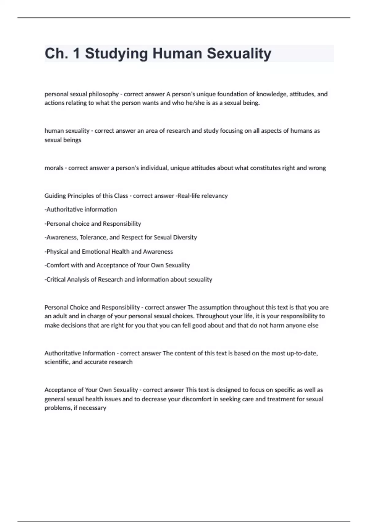 Ch. 1 Studying Human Sexualitypersonal sexual philosophy - correct answer A person's unique foundation of knowledge, attitudes, and actions relating to what the person wants and who he/she is as a sexual being. human sexuality - correct answer an area of research and study focusing on all aspects of humans as sexual beings morals - correct answer a person's individual, unique attitudes about what constitutes right and wrong Guiding Principles of this Class - correct answer -Real-life relevancy -Authoritative information -Personal choice and Responsibility -Awareness, Tolerance, and Respect for Sexual Diversity -Physical and Emotional Health and Awareness -Comfort with and Acceptance of Your Own Sexuality -Critical Analysis of Research and information about sexuality Personal Choice and Responsibility - correct answer The assumption throughout this text is that you are an adult and in charge of your personal sexual choices. Throughout your life, it is your responsibility to make decisions that are right for you that you can fell good about and that do not harm anyone else Authoritative Information - correct answer The content of this text is based on the most up-to-date, scientific, and accurate research Acceptance of Your Own Sexuality - correct answer This text is designed to focus on specific as well as general sexual health issues and to decrease your discomfort in seeking care and treatment for sexual problems, if necessary