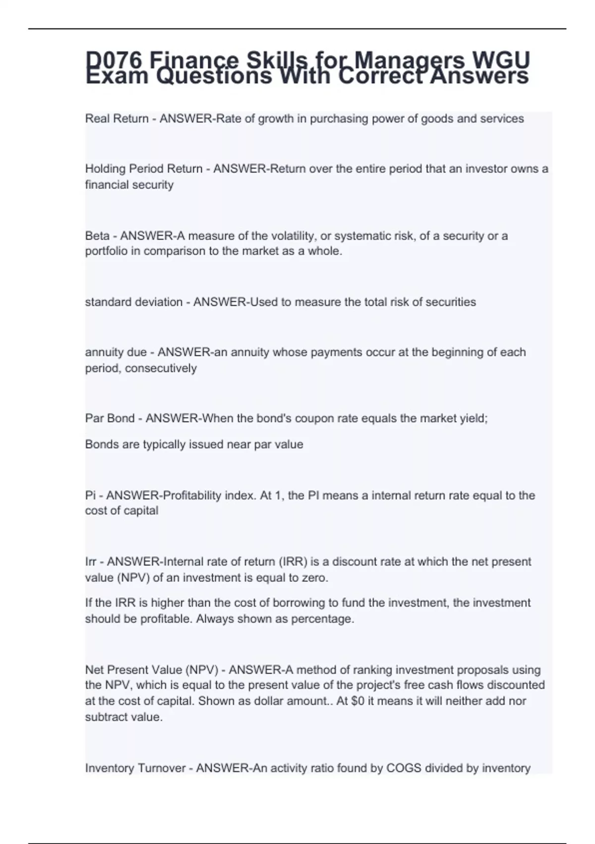 Real Return - ANSWER-Rate of growth in purchasing power of goods and services Holding Period Return - ANSWER-Return over the entire period that an investor owns a financial security Beta - ANSWER-A measure of the volatility, or systematic risk, of a security or a portfolio in comparison to the market as a whole. standard deviation - ANSWER-Used to measure the total risk of securities annuity due - ANSWER-an annuity whose payments occur at the beginning of each period, consecutively Par Bond - ANSWER-When the bond's coupon rate equals the market yield; Bonds are typically issued near par value Pi - ANSWER-Profitability index. At 1, the PI means a internal return rate equal to the cost of capital Irr - ANSWER-Internal rate of return (IRR) is a discount rate at which the net present value (NPV) of an investment is equal to zero. If the IRR is higher than the cost of borrowing to fund the investment, the investment should be profitable. Always shown as percentage. Net Present Value (NPV) - ANSWER-A method of ranking investment proposals using the NPV, which is equal to the present value of the project's free cash flows discounted at the cost of capital. Shown as dollar amount.. At $0 it means it will neither add nor subtract value.