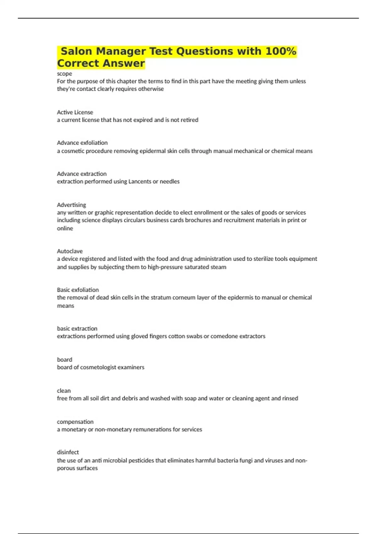 Salon Manager Test Questions with 100% Correct Answer scope For the purpose of this chapter the terms to find in this part have the meeting giving them unless they're contact clearly requires otherwise Active License a current license that has not expired and is not retired Advance exfoliation a cosmetic procedure removing epidermal skin cells through manual mechanical or chemical means Advance extraction extraction performed using Lancents or needles Advertising any written or graphic representation decide to elect enrollment or the sales of goods or services including science displays circulars business cards brochures and recruitment materials in print or online Autoclave a device registered and listed with the food and drug administration used to sterilize tools equipment and supplies by subjecting them to high-pressure saturated steam Basic exfoliation the removal of dead skin cells in the stratum corneum layer of the epidermis to manual or chemical means basic extraction extractions performed using gloved fingers cotton swabs or comedone extractors board board of cosmetologist examiners clean free from all soil dirt and debris and washed with soap and water or cleaning agent and rinsed compensation a monetary or non-monetary remunerations for services disinfect the use of an anti microbial pesticides that eliminates harmful bacteria fungi and viruses and non-porous surfaces disinfectant an anti-microbial pesticide that is registered with the EPA for the used in hospital setting and is a bactericide virucide and fungicide Electric energy treatments advance practice esthetic services for cosmetic care of the skin that uses electrical energy as applied by skin care equipment used on the epidermal layer. Electrical energy treatments use light, direct current, indirect current or sound energy but do not include laser extraction cosmetic technique of removing impactions and comedowns from follicles good repair is clean with no holes, frayed wires or tears in coverings and fully operational for the purpose intended hazardous substance or harmful physical agent as defined under part 5206.1500, subpart 6, or any substance defined as hazard in the code of the federal regulations, title 29, part 1910.1200 homebound status A individual lacks the physical or intellectual capacity for independent transportation and is unable to travel independently to a licensed salon License services services defined as the practice of cosmetology under Minnesota statute section 155A .23, subdivision 3 lymphatic drainage A procedure using a light rhythmic pressure applied by manual or other means to the skin using specific lymphatic manipulation to promote drainage of the lymphatic fluid through the tissue Microdermabrasion a cosmetic procedure using mechanical or manual means of light abrasion on the epidermal layer of the skin Mobile structure Means a trailer or other enclosed space towed by a vehicle. A mobile structure does not include a manufacture home as defined in Minnesota statutes, section 327.31 subdivision 6 nursing home a facility that is licensed under Minnesota statute, chapter 144A, and does not include any attach or adjacent facilities that are not licensed as a nursing home under Minnesota statutes, chapter 144A. Operator a standard license for a practitioner and not a manager license physical location The contiguous space representing each salon that can be accessed by customers without exiting the salon. Porous material A material that absorbs liquid or allows liquid to penetrate Sharps any object, sterile or contaminated, that may purposefully or accidentally cut or penetrate the skin or mucosa including pre-sterilized single use lancets, dermal blade, and razor blades sharps container A closed, punctured resistant, leak proof container labeled with international biohazard symbol, that is used for handling, storage, transportation, and disposable of sharps Simple braiding devices include clips, combs, curlers, curling irons, hairpins, rollers, scissors, needles, and thread. special event a event held for any purpose other than the provision of licensed services, where a participant in the event may receive the limited cosmetology services described in part 2105.0410, subpart 2, at the location not in a licensed salon Sterilization destruction of all microbial life, including spores. Through the use of heat, steam, or chemical sterilants Suite style salon business under part 2105.0397 specializing in leasing or renting individual rooms or suites to licensees , where the salon is license maybe carried by a business or where each suite has its own salon unregulated services ear piercing, body art,body painting and henna tattoos and permanent tattoos, eyebrows embroidery, eyebrow micro blading, permanent hair removal permanent make up, tanning by UV radiation an