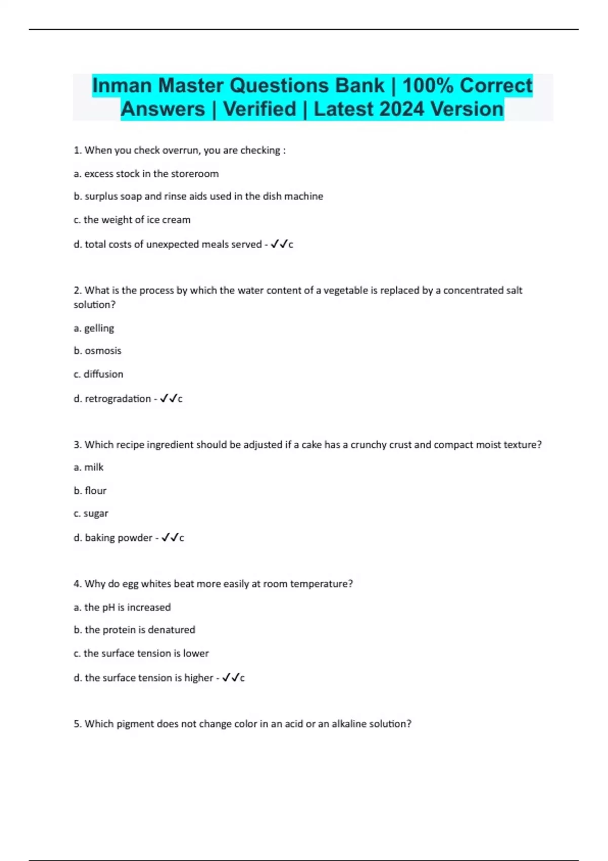 Inman Master Questions Bank | 100% Correct Answers | Verified | Latest 2024 Version 1. When you check overrun, you are checking : a. excess stock in the storeroom b. surplus soap and rinse aids used in the dish machine c. the weight of ice cream d. total costs of unexpected meals served - c 2. What is the process by which the water content of a vegetable is replaced by a concentrated salt solution? a. gelling b. osmosis c. diffusion d. retrogradation - c 3. Which recipe ingredient should be adjusted if a cake has a crunchy crust and compact moist texture? a. milk b. flour c. sugar d. baking powder - c 4. Why do egg whites beat more easily at room temperature? a. the pH is increased b. the protein is denatured c. the surface tension is lower d. the surface tension is higher - c 5. Which pigment does not change color in an acid or an alkaline solution? a. anthocyanin b. chlorophyll c. carotene d. flavones - c 6. The end products of cellular oxidation are: a. water, carbon dioxide, energy b. carbon, hydrogen, nitrogen c. indigestible fiber, nitrogen d. monosaccharides , amino acids, energy - a 7. Carbohydrates listed in order of decreasing sweetness are: a. fructose, glucose, sucrose, sorbitol b. sucrose, glucose, fructose, sorbitol c. fructose, sucrose, glucose, sorbitol d. sorbitol, fructose, sucrose, glucose - c 8. The flakiness of pie crust depends on: a. type of fat b. oxidation of fat c. temperature of the fat d. oven temperature - a 9. A group of rats being fed gelatin as the sole protein source are not growing well. What is the likely reason? a. gelatin has no tryptophan and is low in methionine and lysine b. gelatin has no methionine and is low in tryptophan c. gelatin has no lysine or methionine, and is low in tryptophan d. gelatin has no arginine - a 10. A #10 can holds how many cups of product? a. 10 b. 13 c. 12 d. 5 - b 11. If you replace half and half with whipping cream in ice cream, the effects on the ice crystals will be : a. an increase in size because there is less fat b. a decrease in size because there is more fat c. no change d. an increase in size because there is more fat - b 12. Fat produces more calories than carbohydrate because : a. fat has more carbon and hydrogen in relation to oxygen b. fat has less carbon and hydrogen in relation to oxygen c. fat is a larger molecule d. fat is a smaller molecule - a 13. Research has shown that neural tube defects can be reduced with proper supplementation of: a. iron b. folic acid c. glutamine d. arginine - b 14. The best laboratory value to use in assessing iron status is: a. hemoglobin b. hematocrit c. ferritin