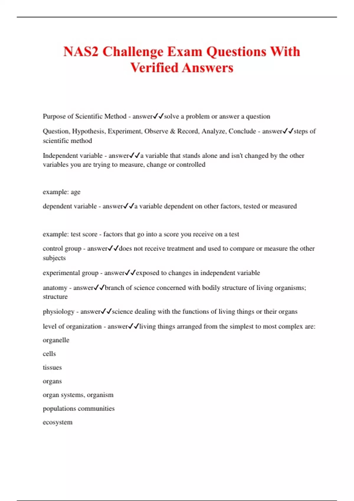 NAS2 Challenge Exam Questions With Verified Answers Purpose of Scientific Method - answersolve a problem or answer a question Question, Hypothesis, Experiment, Observe & Record, Analyze, Conclude - answersteps of scientific method Independent variable - answera variable that stands alone and isn't changed by the other variables you are trying to measure, change or controlled example: age dependent variable - answera variable dependent on other factors, tested or measured example: test score - factors that go into a score you receive on a test control group - answerdoes not receive treatment and used to compare or measure the other subjects experimental group - answerexposed to changes in independent variable anatomy - answerbranch of science concerned with bodily structure of living organisms; structure physiology - answerscience dealing with the functions of living things or their organs level of organization - answerliving things arranged from the simplest to most complex are: organelle cells tissues organs organ systems, organism populations communities ecosystem biosphere requirements for life - answerCellular organization Reproduction Metabolism Homeostasis Heredity Response to stimuli Growth and development Adaptation through evolution survival needs - answerFood, oxygen, water, body temperature, atmospheric pressure (oxygen/carbon dioxide exchange) homeostasis - answerrelatively constant internal physical and chemical conditions that organisms maintain receptor - answersenses environmental stimulus and sends info to control center control center - answerhypothalamus signals effector effector - answerresponds to stimuli example: muscle contracting negative feedback mechanisms - answernet effect is that the original output of the system shuts off the original stimulus or reduces the intensity homeostasis negative feedback mechanisms - answermost common form of homeostasis, bringing people back to normal functioning negative feedback mechanisms - answerexample of homeostasis: adjustments of blood pressure, metabolism, body temp positive feedback mechanisms - answerform of homeostasis level of variable changes in same direction as initial change enhances or accelerates output created by activated stimulus