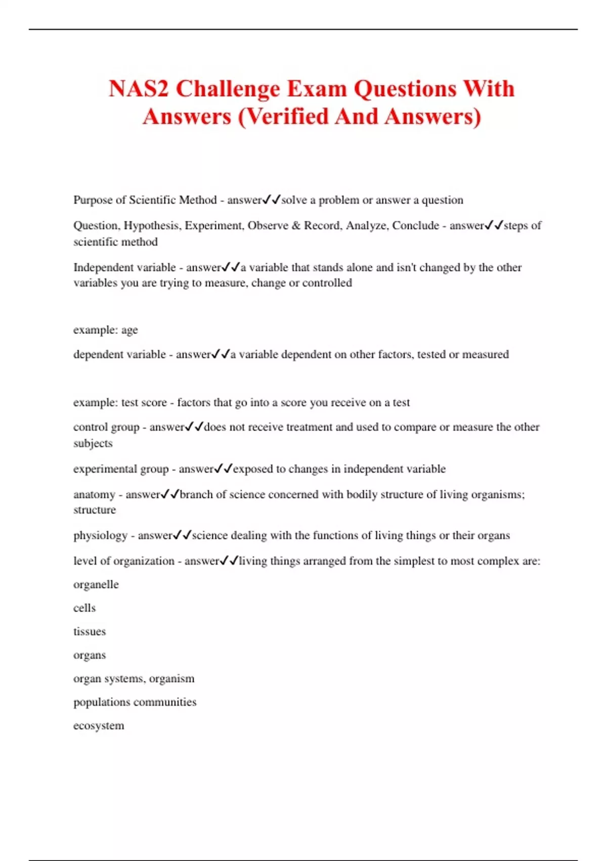 NAS2 Challenge Exam Questions With Answers (Verified And Answers) Purpose of Scientific Method - answersolve a problem or answer a question Question, Hypothesis, Experiment, Observe & Record, Analyze, Conclude - answersteps of scientific method Independent variable - answera variable that stands alone and isn't changed by the other variables you are trying to measure, change or controlled example: age dependent variable - answera variable dependent on other factors, tested or measured example: test score - factors that go into a score you receive on a test control group - answerdoes not receive treatment and used to compare or measure the other subjects experimental group - answerexposed to changes in independent variable anatomy - answerbranch of science concerned with bodily structure of living organisms; structure physiology - answerscience dealing with the functions of living things or their organs level of organization - answerliving things arranged from the simplest to most complex are: organelle cells tissues organs organ systems, organism populations communities ecosystem biosphere requirements for life - answerCellular organization Reproduction Metabolism Homeostasis Heredity Response to stimuli Growth and development Adaptation through evolution survival needs - answerFood, oxygen, water, body temperature, atmospheric pressure (oxygen/carbon dioxide exchange) homeostasis - answerrelatively constant internal physical and chemical conditions that organisms maintain receptor - answersenses environmental stimulus and sends info to control center control center - answerhypothalamus signals effector effector - answerresponds to stimuli example: muscle contracting negative feedback mechanisms - answernet effect is that the original output of the system shuts off the original stimulus or reduces the intensity homeostasis negative feedback mechanisms - answermost common form of homeostasis, bringing people back to normal functioning negative feedback mechanisms - answerexample of homeostasis: adjustments of blood pressure, metabolism, body temp positive feedback mechanisms - answerform of homeostasis level of variable changes in same direction as initial change enhances or accelerates output created by activated stimulus