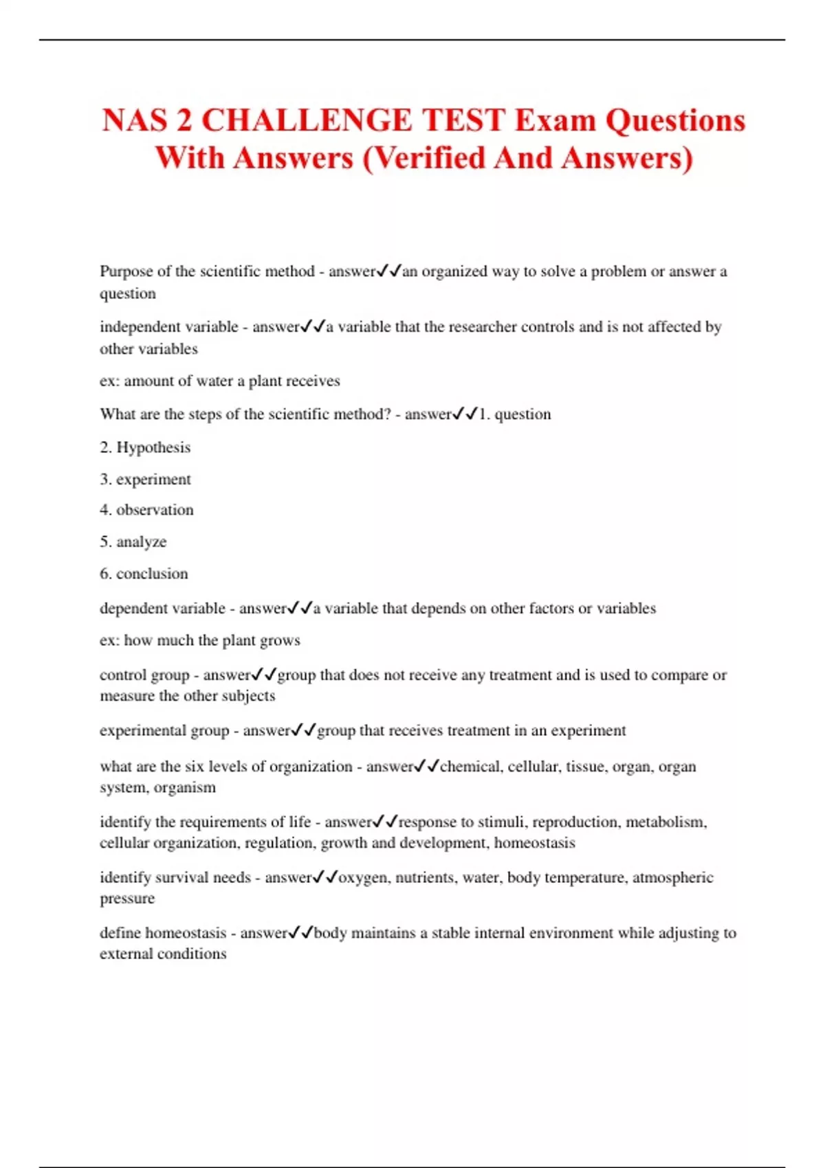 NAS 2 CHALLENGE TEST Exam Questions With Answers (Verified And Answers) Purpose of the scientific method - answeran organized way to solve a problem or answer a question independent variable - answera variable that the researcher controls and is not affected by other variables ex: amount of water a plant receives What are the steps of the scientific method? - answer1. question 2. Hypothesis 3. experiment 4. observation 5. analyze 6. conclusion dependent variable - answera variable that depends on other factors or variables ex: how much the plant grows control group - answergroup that does not receive any treatment and is used to compare or measure the other subjects experimental group - answergroup that receives treatment in an experiment what are the six levels of organization - answerchemical, cellular, tissue, organ, organ system, organism identify the requirements of life - answerresponse to stimuli, reproduction, metabolism, cellular organization, regulation, growth and development, homeostasis identify survival needs - answeroxygen, nutrients, water, body temperature, atmospheric pressure define homeostasis - answerbody maintains a stable internal environment while adjusting to external conditions Receptor - answera sensor that monitors the environment and responds to changes (called stimuli) by sending the information to the control center control center - answerdetermines the set point (level or range a variable is to be maintained at), analyzes the information it receives, and determines the appropriate response. effector - answerprovides the means for the control center's response to the stimulus negative feedback mechanisms - answera feedback mechanism that slows or stops a process. Reduces the effect of the stimulus which decreases productivity ex: the control of blood sugar positive feedback mechanisms - answera feedback mechanism that results in the enhancement of the original stimulus so the activity is accelerated ex: childbirth (if childbirth takes too long the life of the mother and baby are at risk) protons - answerpositive, in the nucleus electron - answernegatively charged particle in the outer shell neutron - answerneutral charge, in the nucleus number of protons is the same as? - answerthe number of electrons what is the atomic number equal to - answernumber of protons (atomic number is top left above atomic symbol) atomic mass - answerthe same as the protons and neutrons added together (at the bottom below atomic symbol) characteristics of ionic bonds - answerbetween metal and nonmetal, high melting and boiling points, generally solid at room temp, hard/brittle, conducts electricity, dissolves in water, gives up one or more electrons to another atom characteristics of covalent bonds - answerbetween nonmetal only(metalloids), atoms share electrons, lower melting and boiling point, usually liquid and gas at room temp, soft, not a conductor of electricity, insoluble (don't dissolve) characteristics of hydrogen bonds - answermore of an attraction than a bond, generally weak bond, always include hydrogen that is already part of a polar molecule ex: water non-polar covalent bond - answerelectrons are shared equally between two atoms polar covalent bond - answerunequal sharing of electrons between two atoms