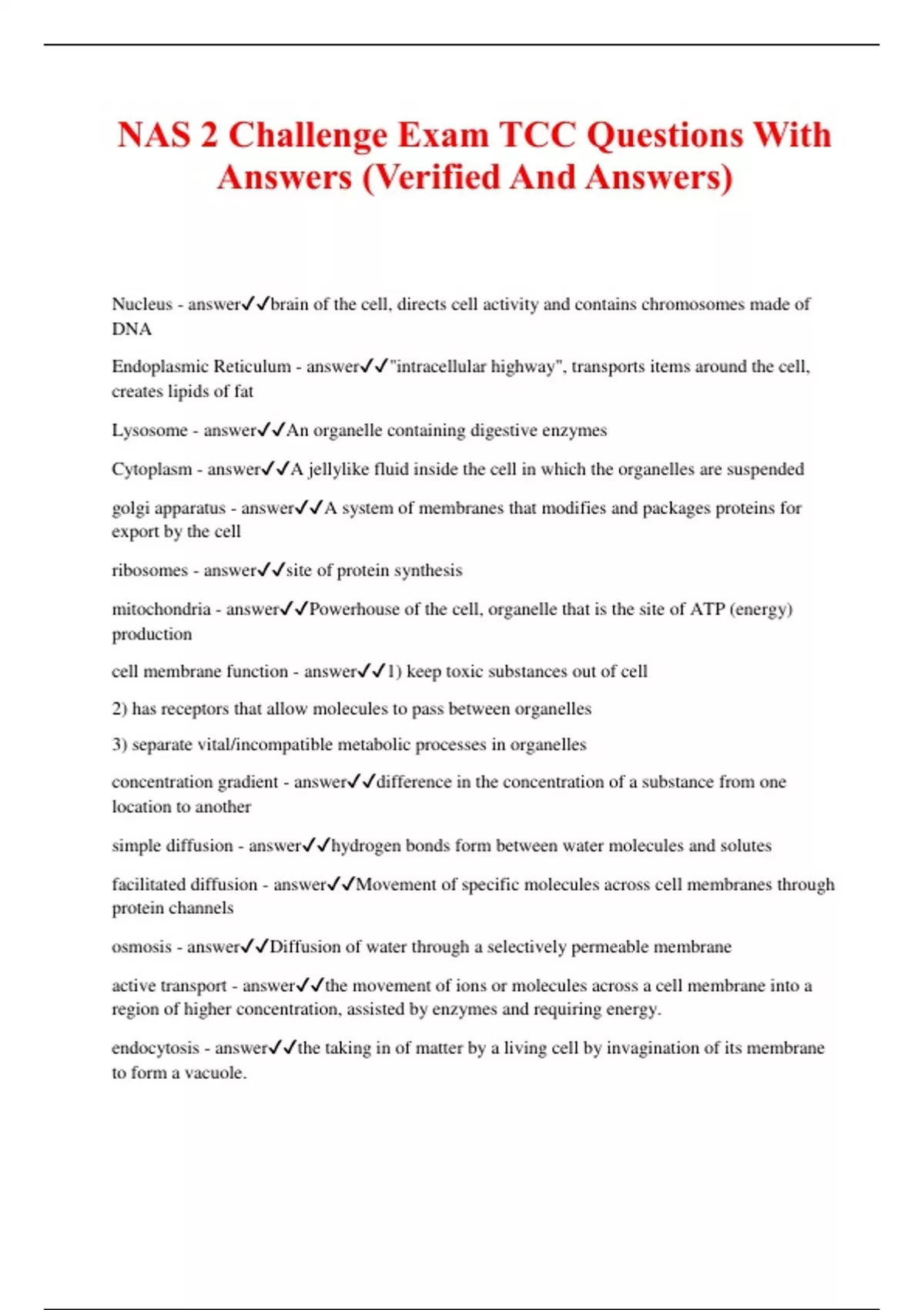 NAS 2 Challenge Exam TCC Questions With Answers (Verified And Answers) Nucleus - answerbrain of the cell, directs cell activity and contains chromosomes made of DNA Endoplasmic Reticulum - answer"intracellular highway", transports items around the cell, creates lipids of fat Lysosome - answerAn organelle containing digestive enzymes Cytoplasm - answerA jellylike fluid inside the cell in which the organelles are suspended golgi apparatus - answerA system of membranes that modifies and packages proteins for export by the cell ribosomes - answersite of protein synthesis mitochondria - answerPowerhouse of the cell, organelle that is the site of ATP (energy) production cell membrane function - answer1) keep toxic substances out of cell 2) has receptors that allow molecules to pass between organelles 3) separate vital/incompatible metabolic processes in organelles concentration gradient - answerdifference in the concentration of a substance from one location to another simple diffusion - answerhydrogen bonds form between water molecules and solutes facilitated diffusion - answerMovement of specific molecules across cell membranes through protein channels osmosis - answerDiffusion of water through a selectively permeable membrane active transport - answerthe movement of ions or molecules across a cell membrane into a region of higher concentration, assisted by enzymes and requiring energy. endocytosis - answerthe taking in of m