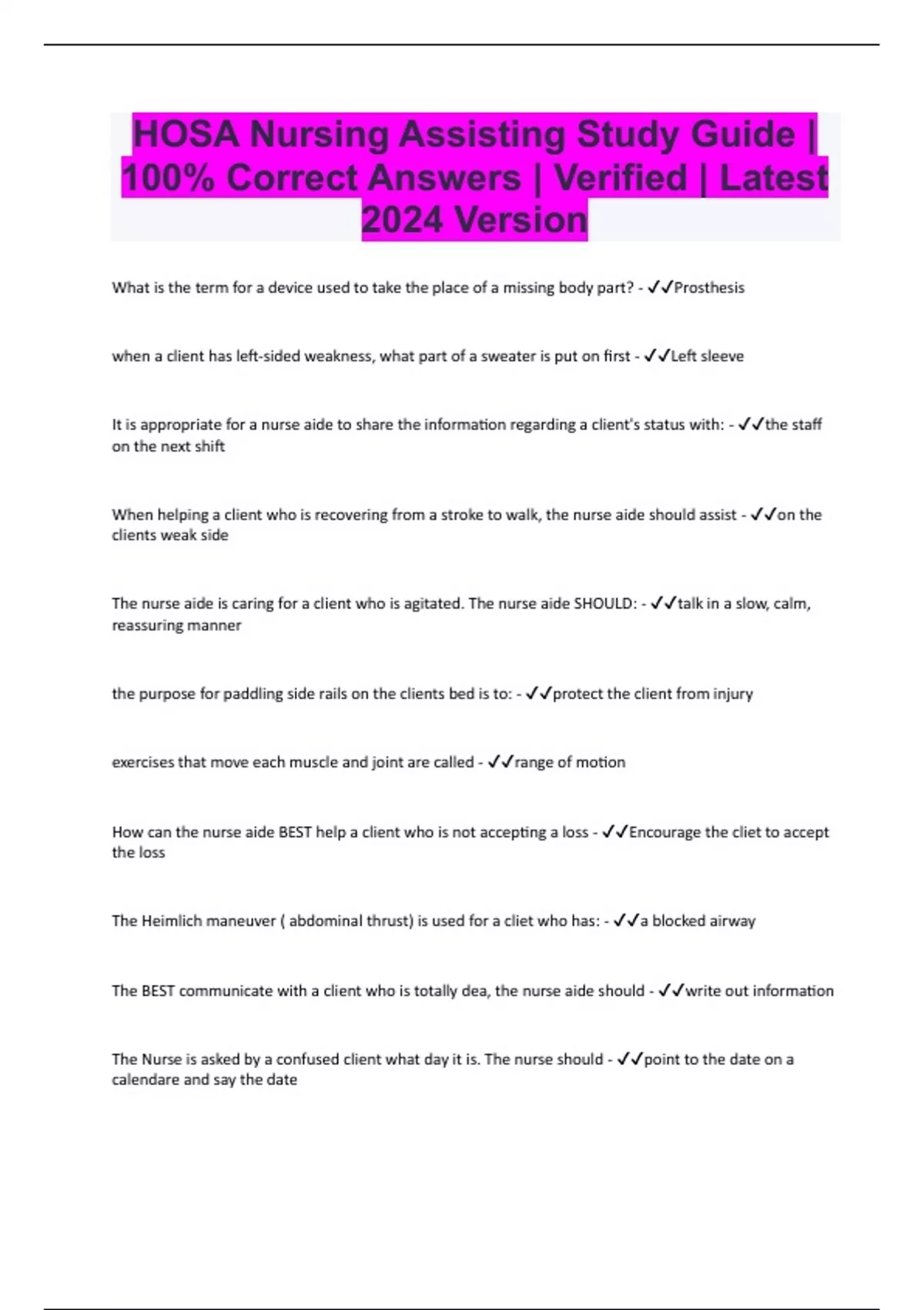 HOSA Nursing Assisting Study Guide | 100% Correct Answers | Verified | Latest 2024 Version