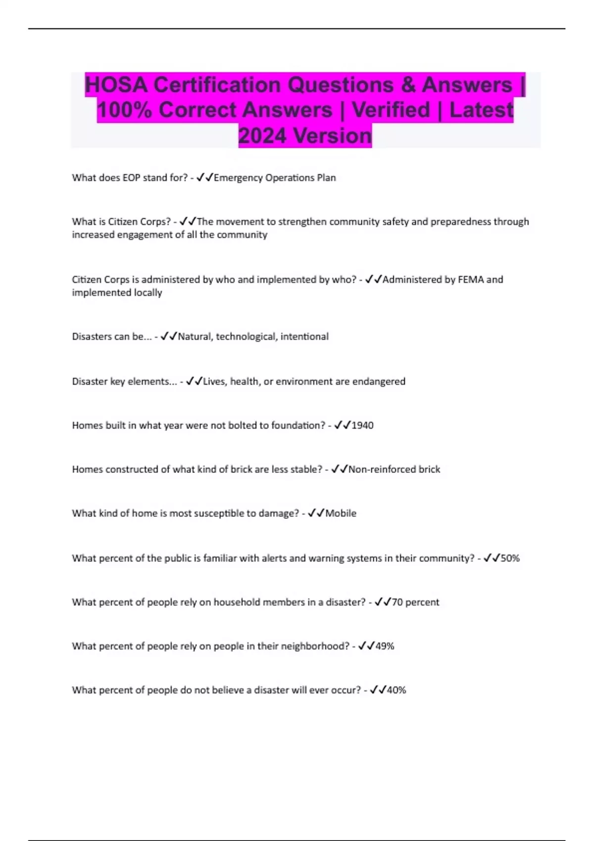 HOSA Certification Questions & Answers | 100% Correct Answers | Verified | Latest 2024 Version