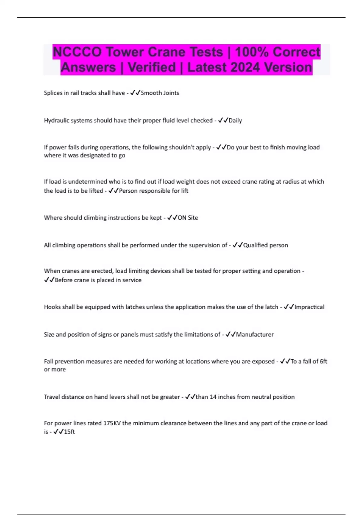 NCCCO Tower Crane Tests | 100% Correct Answers | Verified | Latest 2024 Version