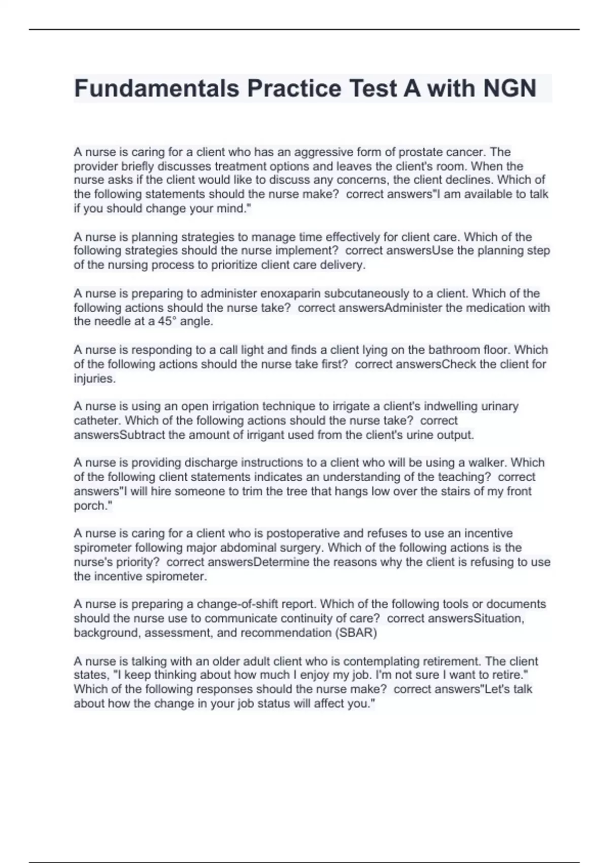 A nurse is caring for a client who has an aggressive form of prostate cancer. The provider briefly discusses treatment options and leaves the client's room. When the nurse asks if the client would like to discuss any concerns, the client declines. Which of the following statements should the nurse make? correct answers"I am available to talk if you should change your mind." A nurse is planning strategies to manage time effectively for client care. Which of the following strategies should the nurse implement? correct answersUse the planning step of the nursing process to prioritize client care delivery. A nurse is preparing to administer enoxaparin subcutaneously to a client. Which of the following actions should the nurse take? correct answersAdminister the medication with the needle at a 45° angle. A nurse is responding to a call light and finds a client lying on the bathroom floor. Which of the following actions should the nurse take first? correct answersCheck the client for injuries. A nurse is using an open irrigation technique to irrigate a client's indwelling urinary catheter. Which of the following actions should the nurse take? correct answersSubtract the amount of irrigant used from the client's urine output. A nurse is providing discharge instructions to a client who will be using a walker. Which of the following client statements indicates an understanding of the teaching? correct answers"I will hire someone to trim the tree that hangs low over the stairs of my front porch." A nurse is caring for a client who is postoperative and refuses to use an incentive spirometer following major abdominal surgery. Which of the following actions is the nurse's priority? correct answersDetermine the reasons why the client is refusing to use the incentive spirometer. A nurse is preparing a change-of-shift report. Which of the following tools or documents should the nurse use to communicate continuity of care? correct answersSituation, background, assessment, and recommendation (SBAR) A nurse is talking with an older adult client who is contemplating retirement. The client states, "I keep thinking about how much I enjoy my job. I'm not sure I want to retire." Which of the following responses should the nurse make? correct answers"Let's talk about how the change in your job status will affect you."