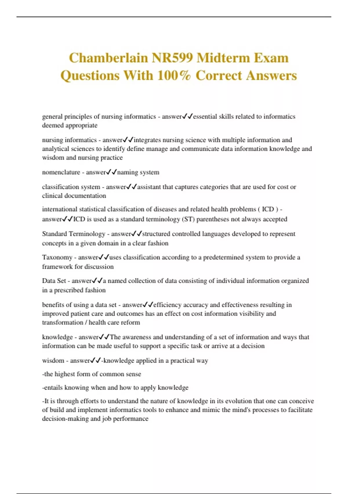 Chamberlain NR599 Midterm Exam Questions With 100% Correct Answers general principles of nursing informatics - answeressential skills related to informatics deemed appropriate nursing informatics - answerintegrates nursing science with multiple information and analytical sciences to identify define manage and communicate data information knowledge and wisdom and nursing practice nomenclature - answernaming system classification system - answerassistant that captures categories that are used for cost or clinical documentation international statistical classification of diseases and related health problems ( ICD ) - answerICD is used as a standard terminology (ST) parentheses not always accepted Standard Terminology - answerstructured controlled languages developed to represent concepts in a given domain in a clear fashion Taxonomy - answeruses classification according to a predetermined system to provide a framework for discussion Data Set - answera named collection of data consisting of individual information organized in a prescribed fashion benefits of using a data set - answerefficiency accuracy and effectiveness resulting in improved patient care and outcomes has an effect on cost information visibility and transformation / health care reform knowledge - answerThe awareness and understanding of a set of information and ways that information can be made useful to support a specific task or arrive at a decision wisdom - answer-knowledge applied in a practical way -the highest form of common sense -entails knowing when and how to apply knowledge -It is through efforts to understand the nature of knowledge in its evolution that one can conceive of build and implement informatics tools to enhance and mimic the mind's processes to facilitate decision-making and job performanc