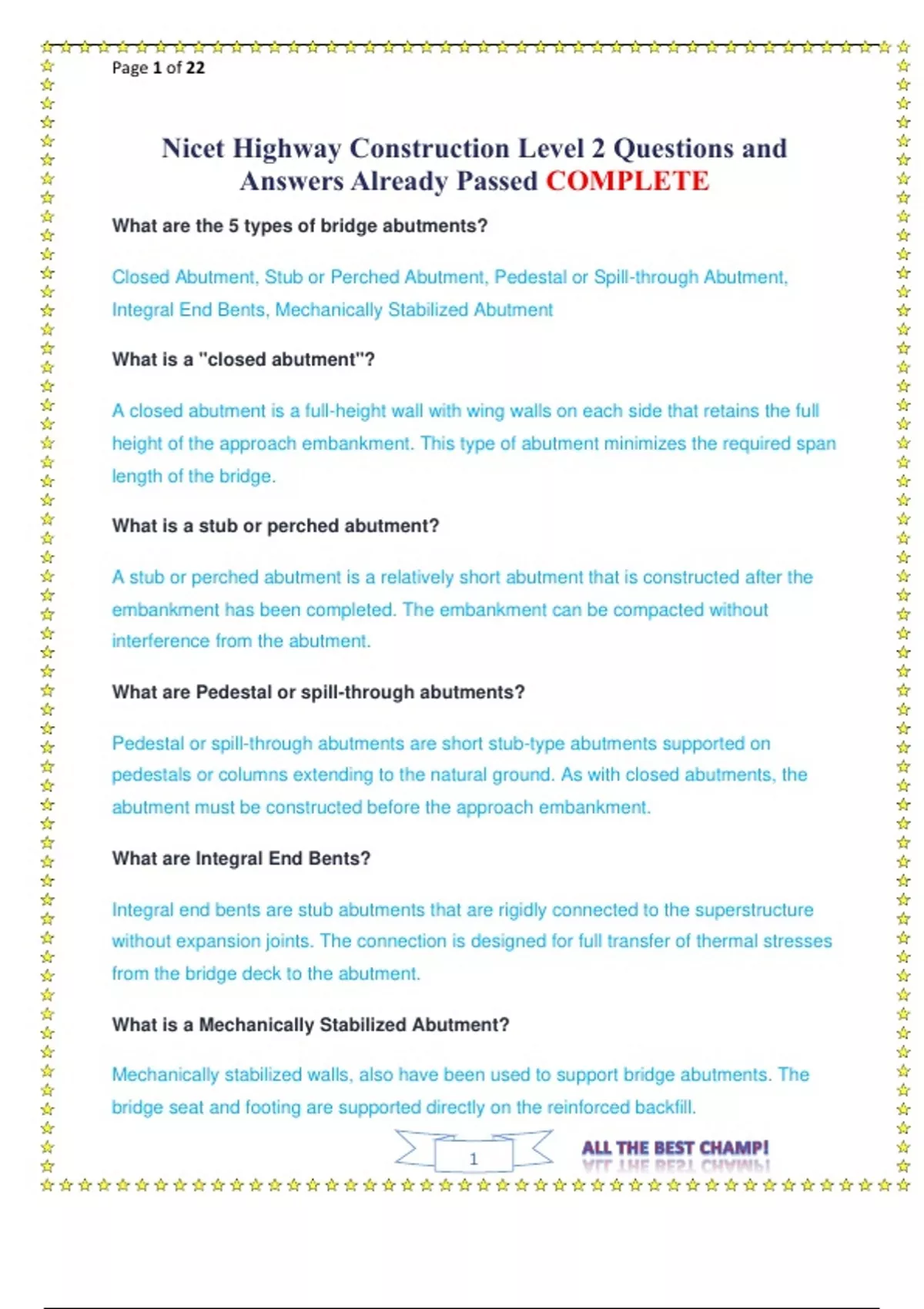 Nicet Highway Construction Level 2 Questions and Answers Already Passed COMPLETE