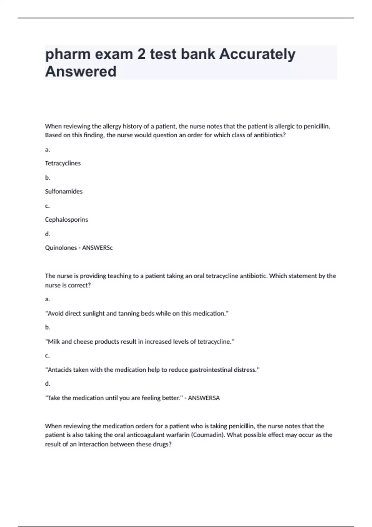 When reviewing the allergy history of a patient, the nurse notes that the patient is allergic to penicillin. Based on this finding, the nurse would question an order for which class of antibiotics? a. Tetracyclines b. Sulfonamides c. Cephalosporins d. Quinolones - ANSWERSc The nurse is providing teaching to a patient taking an oral tetracycline antibiotic. Which statement by the nurse is correct? a. "Avoid direct sunlight and tanning beds while on this medication." b. "Milk and cheese products result in increased levels of tetracycline." c. "Antacids taken with the medication help to reduce gastrointestinal distress." d. "Take the medication until you are feeling better." - ANSWERSA When reviewing the medication orders for a patient who is taking penicillin, the nurse notes that the patient is also taking the oral anticoagulant warfarin (Coumadin). What possible effect may occur as the result of an interaction between these drugs? a. The penicillin will cause an enhanced anticoagulant effect of the warfarin. b. The penicillin will cause the anticoagulant effect of the warfarin to decrease. c. The warfarin will reduce the anti-infective action of the penicillin. d. The warfarin will increase the effectiveness of the penicillin. - ANSWERSA A patient is receiving his third intravenous dose of a penicillin drug. He calls the nurse to report that he is feeling "anxious" and is having trouble breathing. What will the nurse do first? a. Notify the prescriber. b. Take the patient's vital signs. c. Stop the antibiotic infusion. d. Check for allergies. - ANSWERSC A patient is admitted with a fever of 102.8° F (39.3° C), origin unknown. Assessment reveals cloudy, foul-smelling urine that is dark amber in color. Orders have just been written to obtain stat urine and blood cultures and to administer an antibiotic intravenously. The nurse will complete these orders in which sequence? a. Blood culture, antibiotic dose, urine culture b. Urine culture, antibiotic dose, blood culture c. Antibiotic dose, blood and urine cultures d. Blood and urine cultures, antibiotic dose - ANSWERSD During drug therapy with a tetracycline antibiotic, a patient complains of some nausea and decreased appetite. Which statement is the nurse's best advice to the patient? a. "Take it with cheese and crackers or yogurt." b. "Take each dose with a glass of milk." c. "Take an antacid with each dose as needed." d. "Drink a full glass of water with each dose." - ANSWERSD The nurse is monitoring a patient who has been on antibiotic therapy for 2 weeks. Today the patient tells the nurse that he has had watery diarrhea since the day before and is having abdominal cramps. His oral temperature is 101° F (38.3° C). Based on these findings, which conclusion will the nurse draw? a. The patient's original infection has not responded to the antibiotic therapy. b. The patient is showing typical adverse effects of antibiotic therapy. c. The patient needs to be tested for Clostridium difficile infection. d. The patient will need to take a different antibiotic. - ANSWERSC The nurse is monitoring for therapeutic results of antibiotic therapy in a patient with an infection. Which laboratory value would indicate therapeutic effectiveness of this therapy? a. Increased red blood cell count b. Increased hemoglobin level c. Decreased white blood cell count d. Decreased platelet count - ANSWERSC The nurse is reviewing the sputum culture results of a patient with pneumonia and notes that the patient has a gram-positive infection. Which generation of cephalosporin is most appropriate for this type of infection? a. First generation b. Second generation c. Third generation d. Fourth generation - ANSWERSA A patient will be having oral surgery and has received an antibiotic to take for 1 week before the surgery. The nurse knows that this is an example of which type of therapy? a. Empiric b. Prophylactic c. Definitive d. Resistance - ANSWERSB A patient has a urinary tract infection. The nurse knows that which class of drugs is especially useful for such infections? a. Macrolides b. Carbapenems c. Sulfonamides d. Tetracyclines - ANSWERSC During drug therapy for pneumonia, a female patient develops a vaginal superinfection. The nurse explains that this infection is caused by: a. large doses of antibiotics that kill normal flora. b. the infection spreading from her lungs to the new site of infection. c. resistance of the pneumonia-causing bacteria to the drugs. d. an allergic reaction to the antibiotics. - ANSWERSA The nurse is preparing to use an antiseptic. Which statement is correct regarding how antiseptics differ from disinfectants? a. Antiseptics are used to sterilize surgical equipment. b. Disinfectants are used as preoperative skin preparation. c. Antiseptics are used only on living tissue to kill microorganisms. d. Disinfectants are used only on nonliving objects to destroy organisms. - ANSWERSD A patient with a long-term intravenous catheter is going home. The nurse knows that if he is allergic to seafood, which antiseptic agent is contraindicated? a. Chlorhexidine gluconate (Hibiclens) b. Hydrogen peroxide c. Povidone-iodine (Betadine) d. Isopropyl alcohol - ANSWERSC During antibiotic therapy, the nurse will monitor closely for signs and symptoms of a hypersensitivity reaction. Which of these assessment findings may be an indication of a hypersensitivity reaction? (Select all that apply.) a. Wheezing b. Diarrhea c. Shortness of breath d. Swelling of the tongue e. Itching f. Black, hairy tongue - ANSWERSA,C,D,E The nurse is reviewing the medication history of a patient who will be taking a sulfonamide antibiotic. During sulfonamide therapy, a significant drug interaction may occur with which of these drugs or drug classes? (Select all that apply.) a. Opioids b. Oral contraceptives c. Sulfonylureas d. Antihistamines e. Phenytoin (Dilantin) f. Warfarin (Coumadin) - ANSWERSB,C,E,F When a patient is on aminoglycoside therapy, the nurse will monitor the p