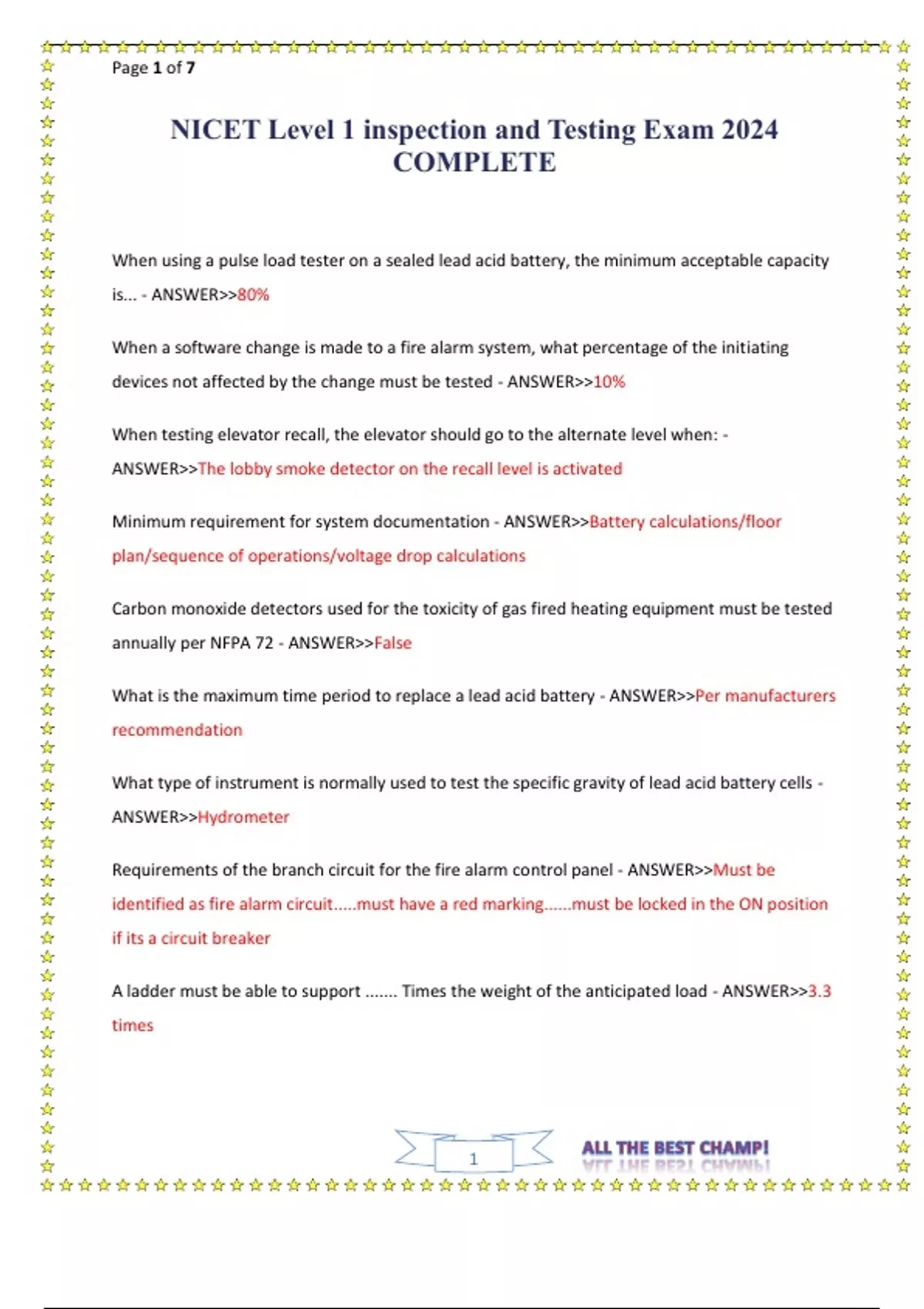 NICET Level 1 inspection and Testing Exam 2024 COMPLETE.