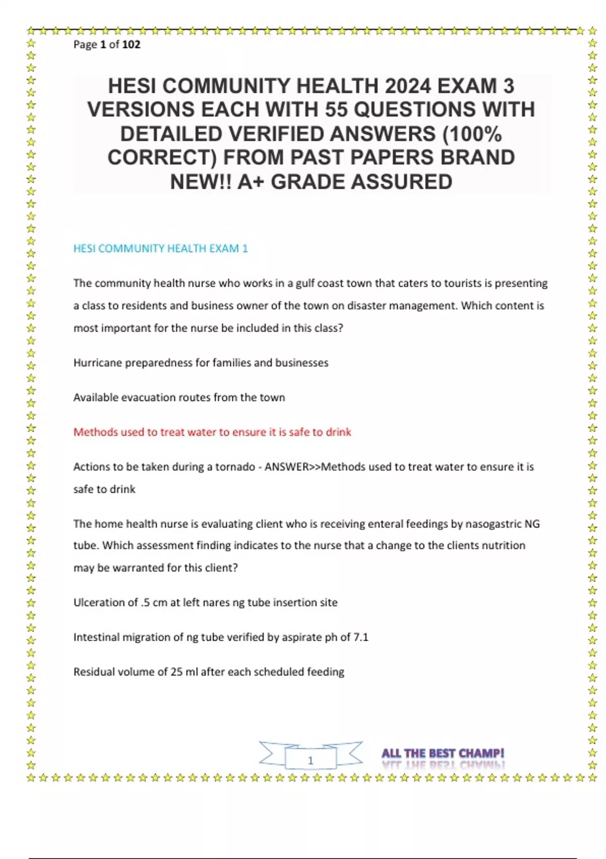 HESI COMMUNITY HEALTH 2024 EXAM 3 VERSIONS EACH WITH 55 QUESTIONS WITH DETAILED VERIFIED ANSWERS (100%- CORRECT) FROM PAST PAPERS BRAND NEW!! A+ GRADE ASSURED