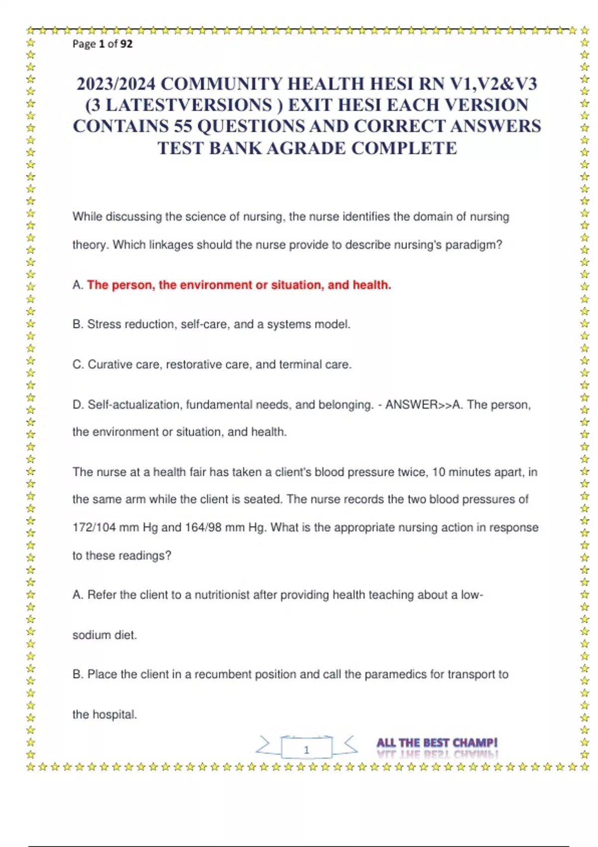 COMMUNITY HEALTH HESI RN V1,V2&V3 (3 LATESTVERSIONS ) EXIT HESI EACH VERSION CONTAINS 55 QUESTIONS AND CORRECT ANSWERS TEST BANK AGRADE COMPLETE