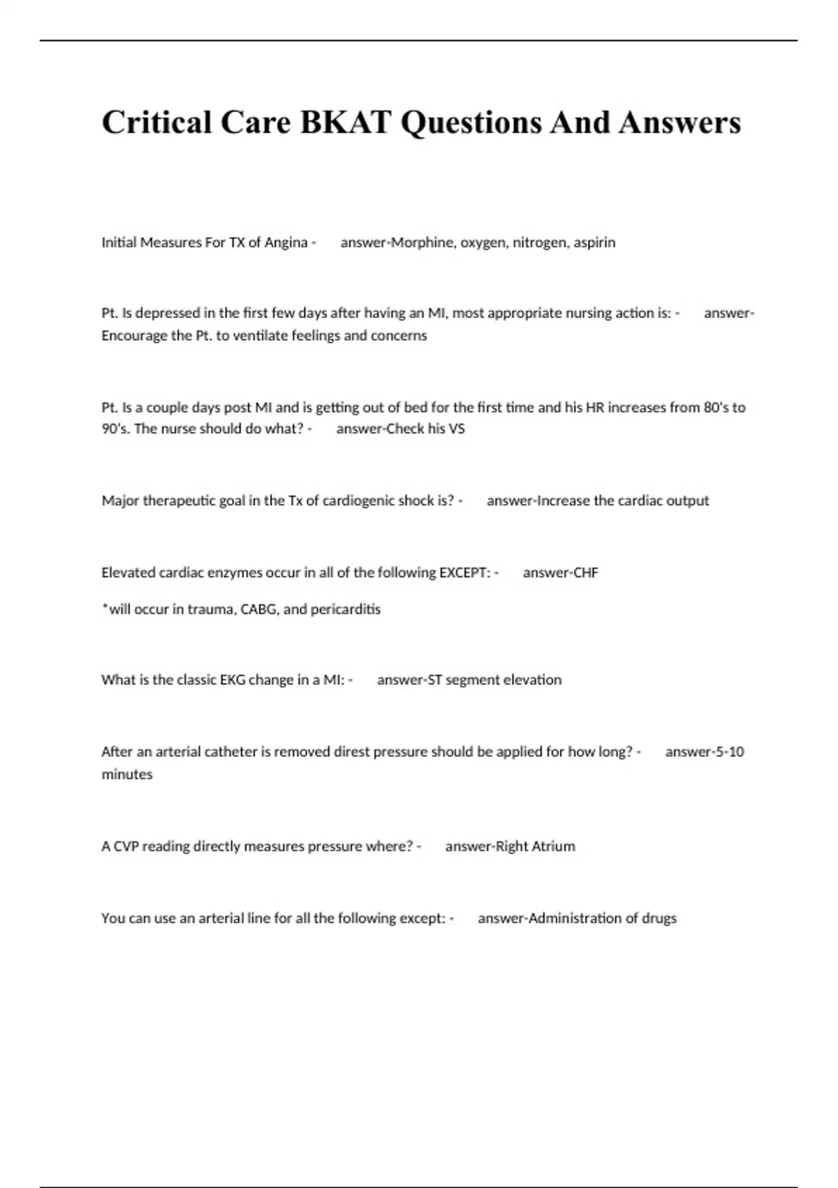Critical Care BKAT Questions And Answers