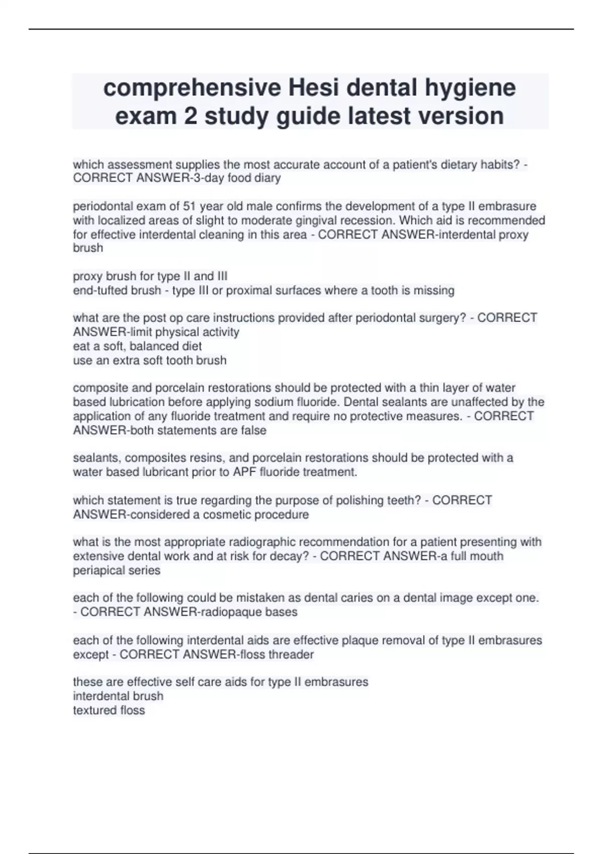 comprehensive Hesi dental hygiene exam 2 study guide latest version which assessment supplies the most accurate account of a patient's dietary habits? - CORRECT ANSWER-3-day food diary periodontal exam of 51 year old male confirms the development of a type II embrasure with localized areas of slight to moderate gingival recession. Which aid is recommended for effective interdental cleaning in this area - CORRECT ANSWER-interdental proxy brush proxy brush for type II and III end-tufted brush - type III or proximal surfaces where a tooth is missing what are the post op care instructions provided after periodontal surgery? - CORRECT ANSWER-limit physical activity eat a soft, balanced diet use an extra soft tooth brush composite and porcelain restorations should be protected with a thin layer of water based lubrication before applying sodium fluoride. Dental sealants are unaffected by the application of any fluoride treatment and require no protective measures. - CORRECT ANSWER-both statements are false sealants, composites resins, and porcelain restorations should be protected with a water based lubricant prior to APF fluoride treatment. which statement is true regarding the purpose of polishing teeth? - CORRECT ANSWER-considered a cosmetic procedure what is the most appropriate radiographic recommendation for a patient presenting with extensive dental work and at risk for decay? - CORRECT ANSWER-a full mouth periapical series each of the following could be mistaken as dental caries on a