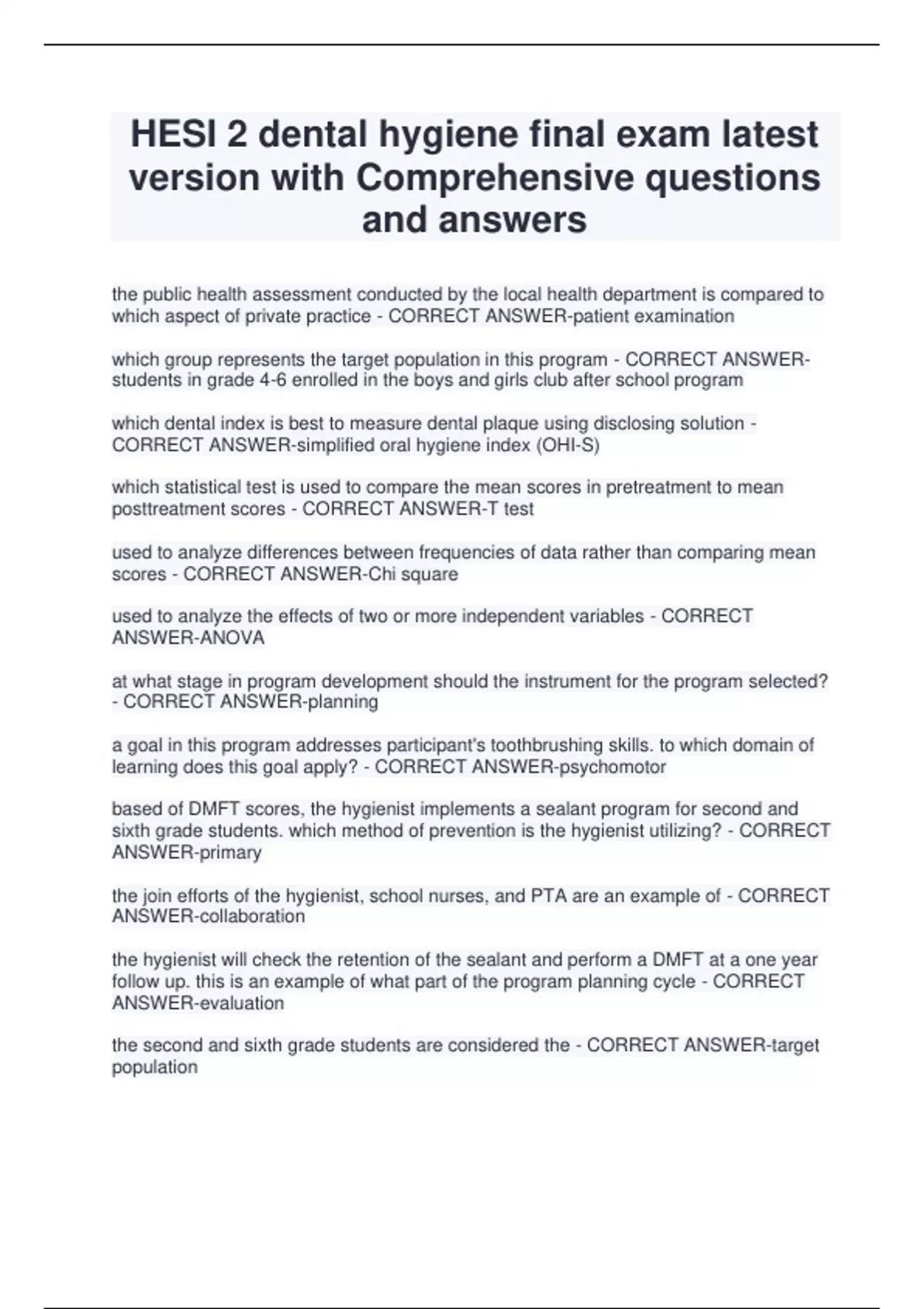 HESI 2 dental hygiene final exam latest version with Comprehensive questions and answers the public health assessment conducted by the local health department is compared to which aspect of private practice - CORRECT ANSWER-patient examination which group represents the target population in this program - CORRECT ANSWERstudents in grade 4-6 enrolled in the boys and girls club after school program which dental index is best to measure dental plaque using disclosing solution - CORRECT ANSWER-simplified oral hygiene index (OHI-S) which statistical test is used to compare the mean scores in pretreatment to mean posttreatment scores - CORRECT ANSWER-T test used to analyze differences between frequencies of data rather than comparing mean scores - CORRECT ANSWER-Chi square used to analyze the effects of two or more independent variables - CORRECT ANSWER-ANOVA at what stage in program development should the instrument for the program selected? - CORRECT ANSWER-planning a goal in this program addresses participant's toothbrushing skills. to which domain of learning does this goal apply? - CORRECT ANSWER-psychomotor based of DMFT scores, the hygienist implements a sealant program for second and sixth grade students. which method of prevent