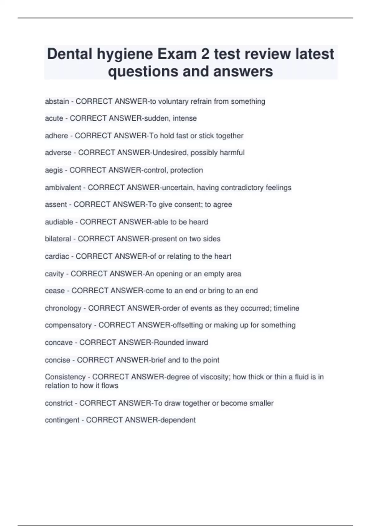Dental hygiene Exam 2 test review latest questions and answers abstain - CORRECT ANSWER-to voluntary refrain from something acute - CORRECT ANSWER-sudden, intense adhere - CORRECT ANSWER-To hold fast or stick together adverse - CORRECT ANSWER-Undesired, possibly harmful aegis - CORRECT ANSWER-control, protection ambivalent - CORRECT ANSWER-uncertain, having contradictory feelings assent - CORRECT ANSWER-To give consent; to agree audiable - CORRECT ANSWER-able to be heard bilateral - CORRECT ANSWER-present on two sides cardiac - CORRECT ANSWER-of or relating to the heart cavity - CORRECT ANSWER-An opening or an empty area cease - CORRECT ANSWER-come to an end or bring to an end chronology - CORRECT ANSWER-order of events as they occurred; timeline compensatory - CORRECT ANSWER-offsetting or making up for something concave - CORRECT ANSWER-Rounded inward concise - CORRECT ANSWER-brief and to the point Consistency - CORRECT ANSWER-degree of viscosity; how thick or thin a fluid is in relation to how it flows constrict - CORRECT ANSWER-To draw together or become smaller contingent - CORRECT ANSWER-dependent contradiction - CORRECT ANSWER-a reason something is not advisable or should not be done convulsive - CORRECT ANSWER-having or causing convulsions, i.e., violent shaking of the body cursory - CORRECT ANSWER-quick, perfunctory, not
