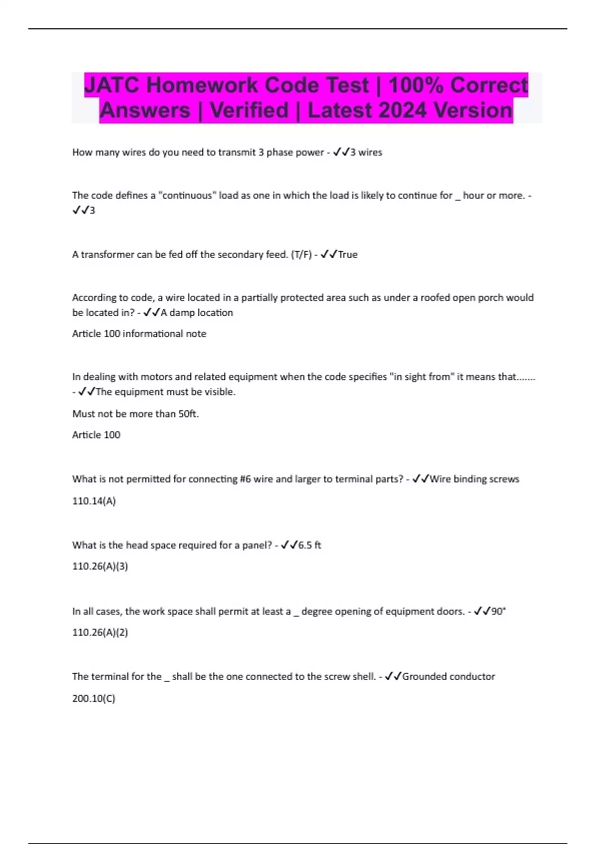 JATC Homework Code Test | 100% Correct Answers | Verified | Latest 2024 Version How many wires do you need to transmit 3 phase power - 3 wires The code defines a "continuous" load as one in which the load is likely to continue for _ hour or more. - 3 A transformer can be fed off the secondary feed. (T/F) - True According to code, a wire located in a partially protected area such as under a roofed open porch would be located in? - A damp location Article 100 informational note In dealing with motors and related equipment when the code specifies "in sight from" it means that....... - The equipment must be visible. Must not be more than 50ft. Article 100 What is not permitted for connecting #6 wire and larger to terminal parts? - Wire binding screws 110.14(A) What is the head space required for a panel? - 6.5 ft 110.26(A)(3) In all cases, the work space shall permit at least a _ degree opening of equipment doors. - 90° 110.26(A)(2) The terminal for the _ shall be the one connected to the screw shell. - Grounded conductor 200.10(C) Circuits fed from direct current systems ungrounded conductors 4awg or larger shall _ at all terminations. - Identify by polarity 210.5(C)(2) In a dwelling unit kitchen which receptacles need to be GFCI A) A receptacle installed to serve kitchen countertop surface B) Receptacle installed under sink C) A receptacle installed within 6ft from the the top inside edge of the bowl of the sink. D) A and C E) All of the above - D 210.8(A)(6&7) A recptacle is 6.5ft away from the outside edge of the bathtub or shower stall needs to be GFCI protected. (T/F) - False Anything installed within 6' needs GFCI, unless specified it is in a bathroom 210.8(A)(9) Laundry branch circuits shall be on a _ branch circuit. - 20A 210.11(C)(2) In general, branch circuit conductors supplying a single motor should have a capacity not less than _% of the motor full loaded circuit rating. - 125% 210.19(A) 430.22 How many 2a fluorescent lights running for 10 hours straight can you put on a 20a branch circuit? - 8 20x.8=16 16/2=8 210.19(A)(1)(a) The branch circuit is rated at 15a, what is the total rating of the equipment fasted in place where lighting units are also supplied? A) 15a B) 7.5a