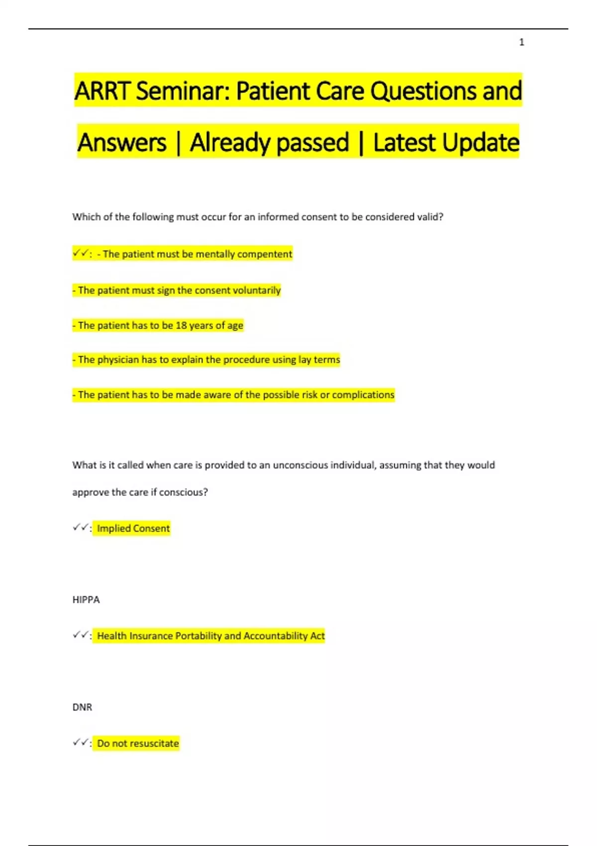 ARRT Seminar: Patient Care Questions and Answers | Already passed | Latest Update