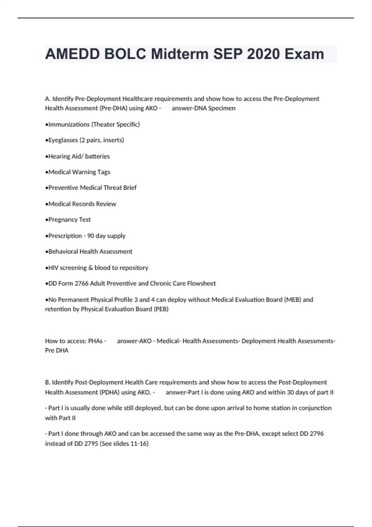 A. Identify Pre-Deployment Healthcare requirements and show how to access the Pre-Deployment Health Assessment (Pre-DHA) using AKO - answer-DNA Specimen •Immunizations (Theater Specific) •Eyeglasses (2 pairs, inserts) •Hearing Aid/ batteries •Medical Warning Tags •Preventive Medical Threat Brief •Medical Records Review •Pregnancy Test •Prescription - 90 day supply •Behavioral Health Assessment •HIV screening & blood to repository •DD Form 2766 Adult Preventive and Chronic Care Flowsheet •No Permanent Physical Profile 3 and 4 can deploy without Medical Evaluation Board (MEB) and retention by Physical Evaluation Board (PEB) How to access: PHAs - answer-AKO - Medical- Health Assessments- Deployment Health Assessments- Pre DHA B. Identify Post-Deployment Health Care requirements and show how to access the Post-Deployment Health Assessment (PDHA) using AKO. - answer-Part I is done using AKO and within 30 days of part II • Part I is usually done while still deployed, but can be done upon arrival to home station in conjunction with Part II • Part I done through AKO and can be accessed the same way as the Pre-DHA, except select DD 2796 instead of DD 2795 (See slides 11-16)