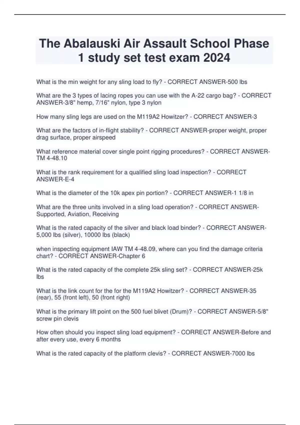 The Abalauski Air Assault School Phase 1 study set test exam 2024 What is the min weight for any sling load to fly? - CORRECT ANSWER-500 lbs What are the 3 types of lacing ropes you can use with the A-22 cargo bag? - CORRECT ANSWER-3/8" hemp, 7/16" nylon, type 3 nylon How many sling legs are used on the M119A2 Howitzer? - CORRECT ANSWER-3 What are the factors of in-flight stability? - CORRECT ANSWER-proper weight, proper drag surface, proper airspeed What reference material cover single point rigging procedures? - CORRECT ANSWERTM 4-48.10 What is the rank requirement for a qualified sling load inspection? - CORRECT ANSWER-E-4 What is the diameter of the 10k apex pin portion? - CORRECT ANSWER-1 1/8 in What are the three units involved in a sling load operation? - CORRECT ANSWERSupported, Aviation, Receiving What is the rated capacity of the silver and black load binder? - CORRECT ANSWER5,000 lbs (silver), 10000 lbs (black) when inspecting equipment IAW TM 4-48.09, where can you find the damage criteria chart? - CORRECT ANSWER-Chapter 6 What is the rated capacity of the complete 25k sling set? - CORRECT ANSWER-25k lbs What is the link count for the for the M119A2 Howitzer? - CORRECT ANSWER-35 (rear), 55 (front left), 50 (front right) What is the primary lift point on the 500 fuel blivet (Drum)? - CORRECT ANSWER-5/8" screw pin clevis How often should you inspect sling load equi