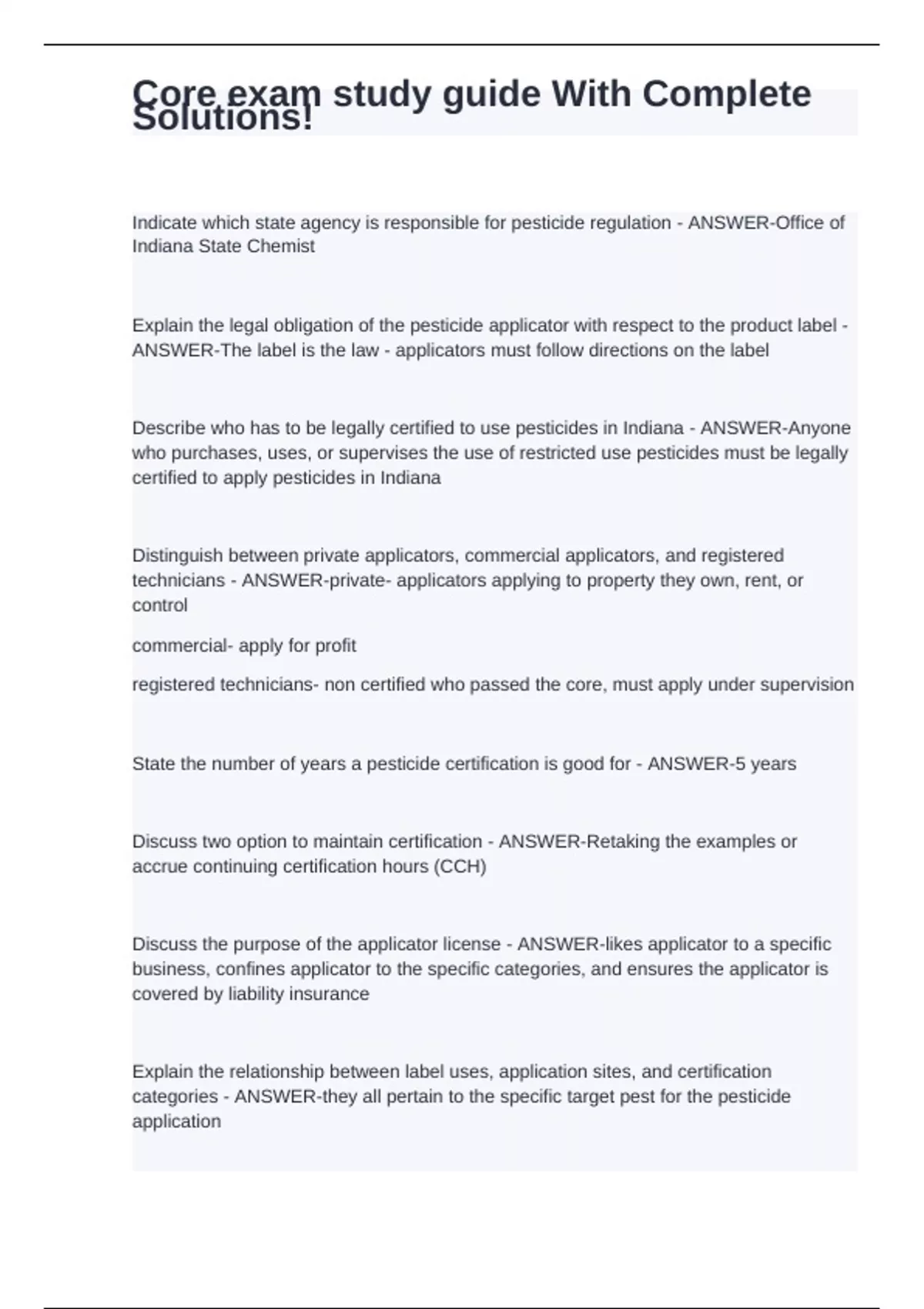 Indicate which state agency is responsible for pesticide regulation - ANSWER-Office of Indiana State Chemist Explain the legal obligation of the pesticide applicator with respect to the product label - ANSWER-The label is the law - applicators must follow directions on the label Describe who has to be legally certified to use pesticides in Indiana - ANSWER-Anyone who purchases, uses, or supervises the use of restricted use pesticides must be legally certified to apply pesticides in Indiana Distinguish between private applicators, commercial applicators, and registered technicians - ANSWER-private- applicators applying to property they own, rent, or control commercial- apply for profit registered technicians- non certified who passed the core, must apply under supervision State the number of years a pesticide certification is good for - ANSWER-5 years Discuss two option to maintain certification - ANSWER-Retaking the examples or accrue continuing certification hours (CCH) Discuss the purpose of the applicator license - ANSWER-likes applicator to a specific business, confines applicator to the specific categories, and ensures the applicator is covered by liability insurance Explain the relationship between label uses, application sites, and certification categories - ANSWER-they all pertain to the specific target pest for the pesticide application State who has to maintain a pesticide business license - ANSWER-Firms engaged in the business of applying pesticides on the property of another for hire State when a certified, licensed supervisor must remain on site with a non-certified employee - ANSWER-Always, unless the employee is a registered technician with the OISC State how a non-certified employee can become a registered technician - ANSWER-They must pass the core exam and their employer must apply on their behalf for credentials, they must be at least 16 years old, capable of reading and understanding written instructions, including labels List the items that a certified, licensed supervisor must provide a registered technician before sending them to work off-site - ANSWER-A category specific risk assessment fact sheet, labels of the products being applied, PPE and a phone number at which they'll be available List what activities may be performed by a registered technician - ANSWER-Pest control operations in which their direct supervisor is certified and licensed