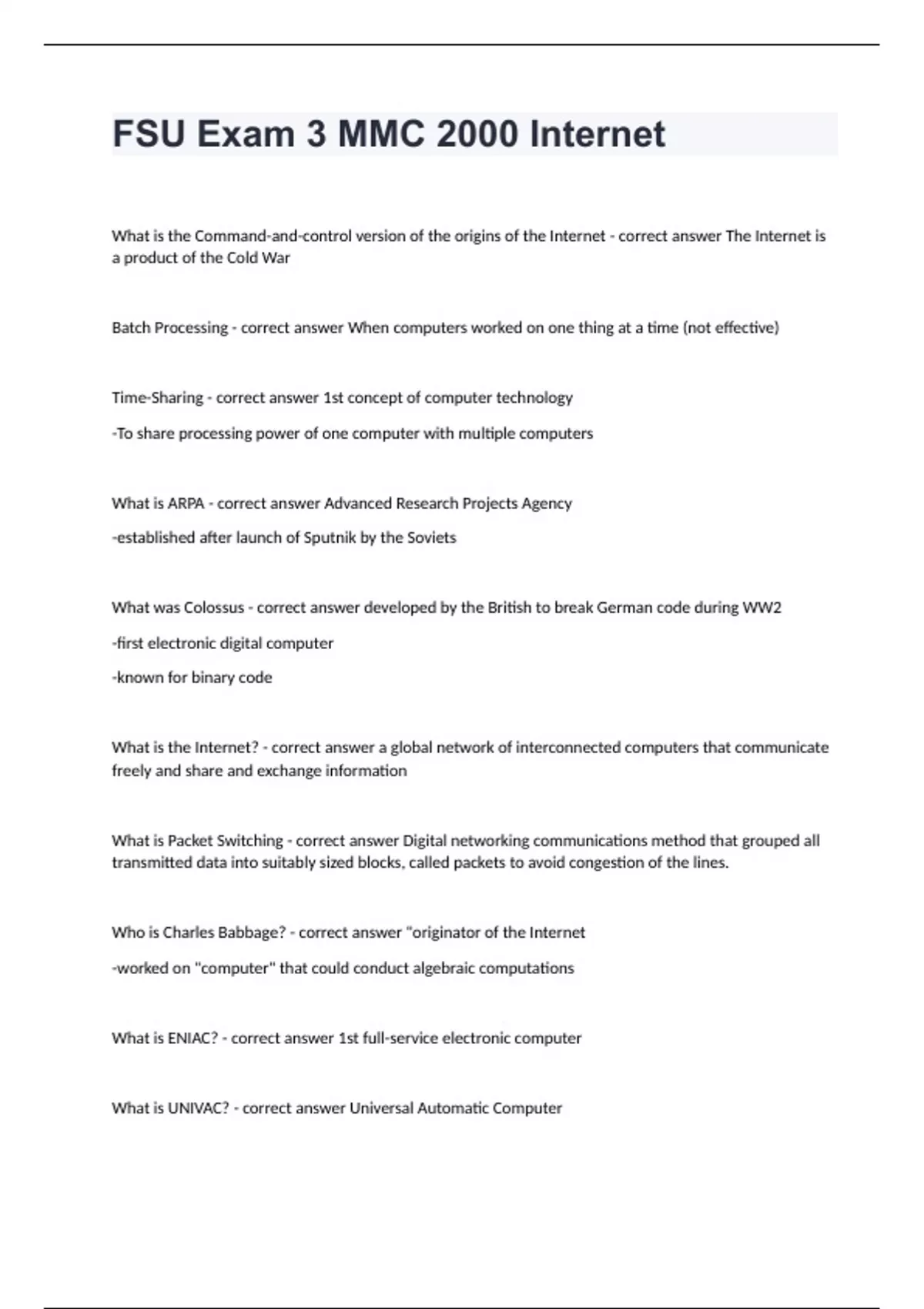FSU Exam 3 MMC 2000 InternetWhat is the Command-and-control version of the origins of the Internet - correct answer The Internet is a product of the Cold War Batch Processing - correct answer When computers worked on one thing at a time (not effective) Time-Sharing - correct answer 1st concept of computer technology -To share processing power of one computer with multiple computers What is ARPA - correct answer Advanced Research Projects Agency -established after launch of Sputnik by the Soviets What was Colossus - correct answer developed by the British to break German code during WW2 -first electronic digital computer -known for binary code What is the Internet? - correct answer a global network of interconnected computers that communicate freely and share and exchange information What is Packet Switching - correct answer Digital networking communications method that grouped all transmitted data into suitably sized blocks, called packets to avoid congestion of the lines. Who is Charles Babbage? - correct answer "originator of the Internet -worked on "computer" that could conduct algebraic computations