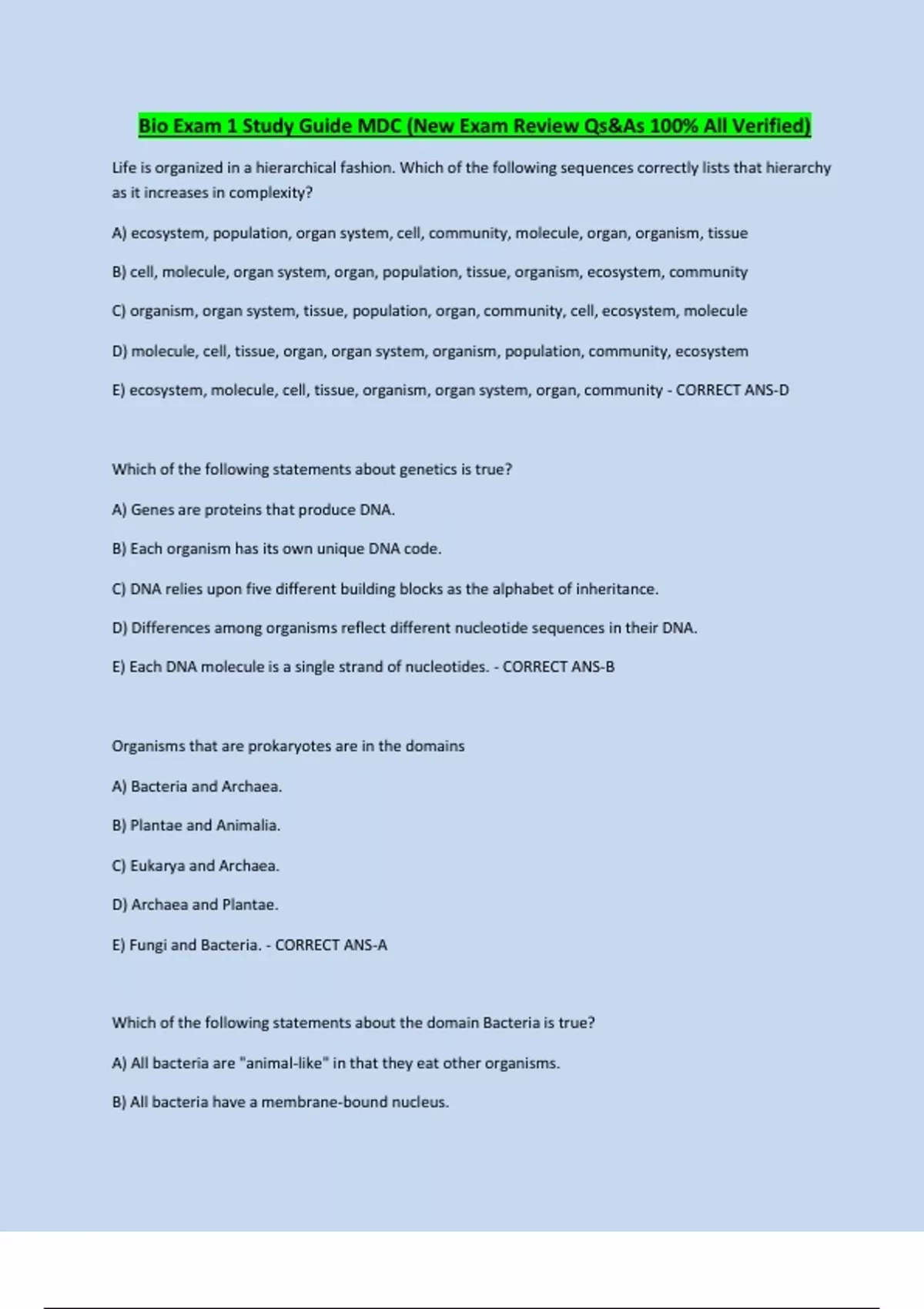 Life is organized in a hierarchical fashion. Which of the following sequences correctly lists that hierarchy as it increases in complexity? A) ecosystem, population, organ system, cell, community, molecule, organ, organism, tissue B) cell, molecule, organ system, organ, population, tissue, organism, ecosystem, community C) organism, organ system, tissue, population, organ, community, cell, ecosystem, molecule D) molecule, cell, tissue, organ, organ system, organism, population, community, ecosystem E) ecosystem, molecule, cell, tissue, organism, organ system, organ, community - CORRECT ANS-D Which of the following statements about genetics is true? A) Genes are proteins that produce DNA. B) Each organism has its own unique DNA code. C) DNA relies upon five different building blocks as the alphabet of inheritance. D) Differences among organisms reflect different nucleotide sequences in their DNA. E) Each DNA molecule is a single strand of nucleotides. - CORRECT ANS-B Organisms that are prokaryotes are in the domains A) Bacteria and Archaea. B) Plantae and Animalia. C) Eukarya and Archaea. D) Archaea and Plantae. E) Fungi and Bacteria. - CORRECT ANS-A Which of the following statements about the domain Bacteria is true? A) All bacteria are "animal-like" in that they eat other organisms. B) All bacteria have a membrane-bound nucleus. C) All bacteria are multicellular organisms. D) All bacteria lack a nucleus. E) All bacteria are "animal-like" in that they eat other organisms, and all bacteria - CORRECT ANS-D Which of the following is a kingdom within the domain Eukarya? A) Viruses B) Monera C) Fungi D) Archaea E) Bacteria - CORRECT ANS-C All organisms belonging to the kingdom Plantae A) are photosynthetic. B) contain cells that are surrounded by cell walls with cellulose. C) are unicellular and lack a nucleus. D) lack a nucleus. E) are photosynthetic and contain cells that are surrounded by cell walls with cellulose - CORRECT ANS-E Members of the kingdom Fungi A) include the mushrooms. B) include the yeasts. C) decompose the remains of dead organisms and absorb nutrients from the leftovers. D) include the mushrooms and yeasts, and decompose the remains of dead organisms and absorb nutrients from the leftovers. E) use photosynthesis to produce their own food. - CORRECT ANS-D Which of the following statements is not consistent with Darwin's theory of natural selection? A) Individuals in a population exhibit variations, some of which are heritable. B) Individual organisms exhibit genetic change during their life spans to better fit their environment. C) Factors in the environment result in some organisms with better reproductive success than others. D) Natural selection is based in part on the overproduction of offspring. E) Natural selection can lead to the appearance of new species. - CORRECT ANS-D Which of the following statements about evolution is true? A) Individuals evolve within the span of their own lifetimes. B) Organisms evolve structures in response to needs. C) Evolution is deliberate and purposeful. D) Evolution is a passive process. E) Evolution is directional. - CORRECT ANS-D A hypothesis is A) the same as a theory. B) a tentative answer to some question. C) an explanatory idea that is broad in scope and supported by a large body of evidence. D) a widely accepted idea about a phenomenon. E) a widely accepted theory that is broad in scope and supported by a large body - CORRECT ANS-B A theory is A) an idea that has been proven. B) a concept in the early stages that still needs to be tested. C) a belief that has been accepted by all scientists as fact. D) a description of a belief that invokes the supernatural. E) an explanation of an idea that is broad in scope with multiple lines of evidence - CORRECT ANS-E To be scientifically valid, a hypothesis must be A) phrased as a question. B) based on faith. C) controlled. D) reasonable. E) testable and falsifiable. - CORRECT ANS-E The four most common elements in living organisms are A) C, H, O, Fe. B) C, H, O, Na. C) C, H, O, N. D) C, N, O, Na. E) Fe, N, O, Ca. - CORRECT ANS-C Which of the following is a trace element in the human body? A) carbon B) nitrogen C) zinc D) oxygen E) hydrogen - CORRECT ANS-C Which of the following trace elements is commonly added to table salt to prevent the formation of goiters? A) iodine B) iron C) calcium D) magnesium E) fluoride - CORRECT ANS-A Which of the following statements best describes a compound? A) A compound is a pure element. B) A compound is less common than a pure element. C) A compound contains two or more different elements in a fixed ratio. D) A compound is exemplified by sodium. E) A compound is a solution. - CORRECT ANS-C Which of the following particles is found in the nucleus of an atom? A) protons and neutrons B) protons and electrons C) only neutrons D) only protons E) only electrons - CORRECT ANS-A Which of the following best describes the atomic number of an atom? A) the number of protons in the atom B) the number of electrons in the atom C) the number of neutrons in the atom D) the number of protons, electrons, and neutrons in the atom E) the net electrical charge of the atom - CORRECT ANS-A A radioactive isotope is an isotope that A) is stable. B) decays. C) has more protons than the common variant of the element. D) has more electrons than the common variant of the element. E) has the same atomic mass, but a different atomic number than the common variant of the element. - CORRECT ANS-B If you found a fossilized dinosaur bone, what method could be used to determine the age of the fossil? A) electrophoresis B) DNA fingerprinting C) isotope analysis D) radial immunodiffusion E) high-pressure liquid chromatography - CORRECT ANS-C Radioactive isotopes A) are frequently added to foods as nutritional supplements. B) can be used in conjunction with PET scans to diagnose diseases. C) have no effect on living tissue. D) do not occur naturally. E) are never incorporated into organic com