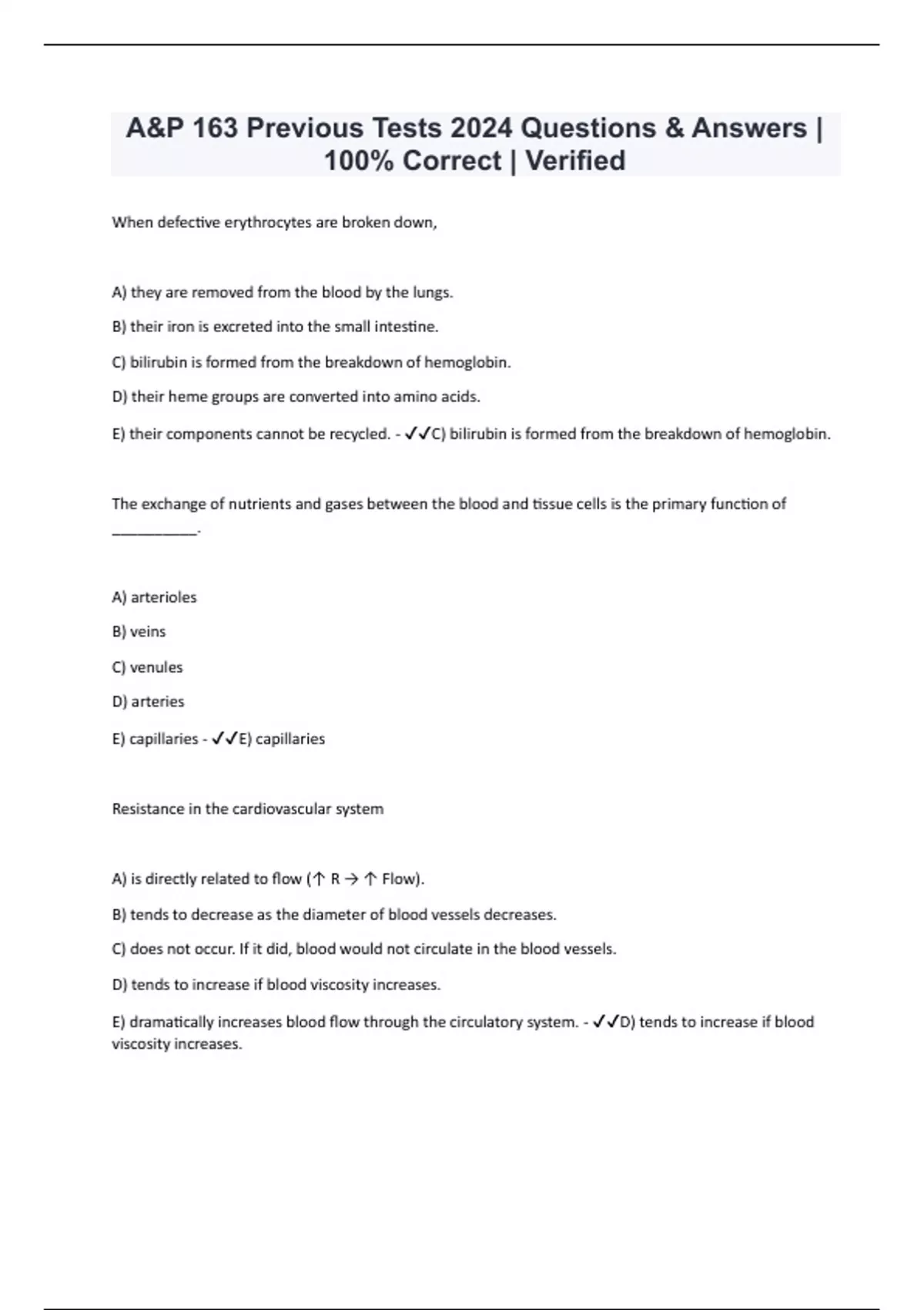 A&P 163 Previous Tests 2024 Questions & Answers | 100% Correct | Verified