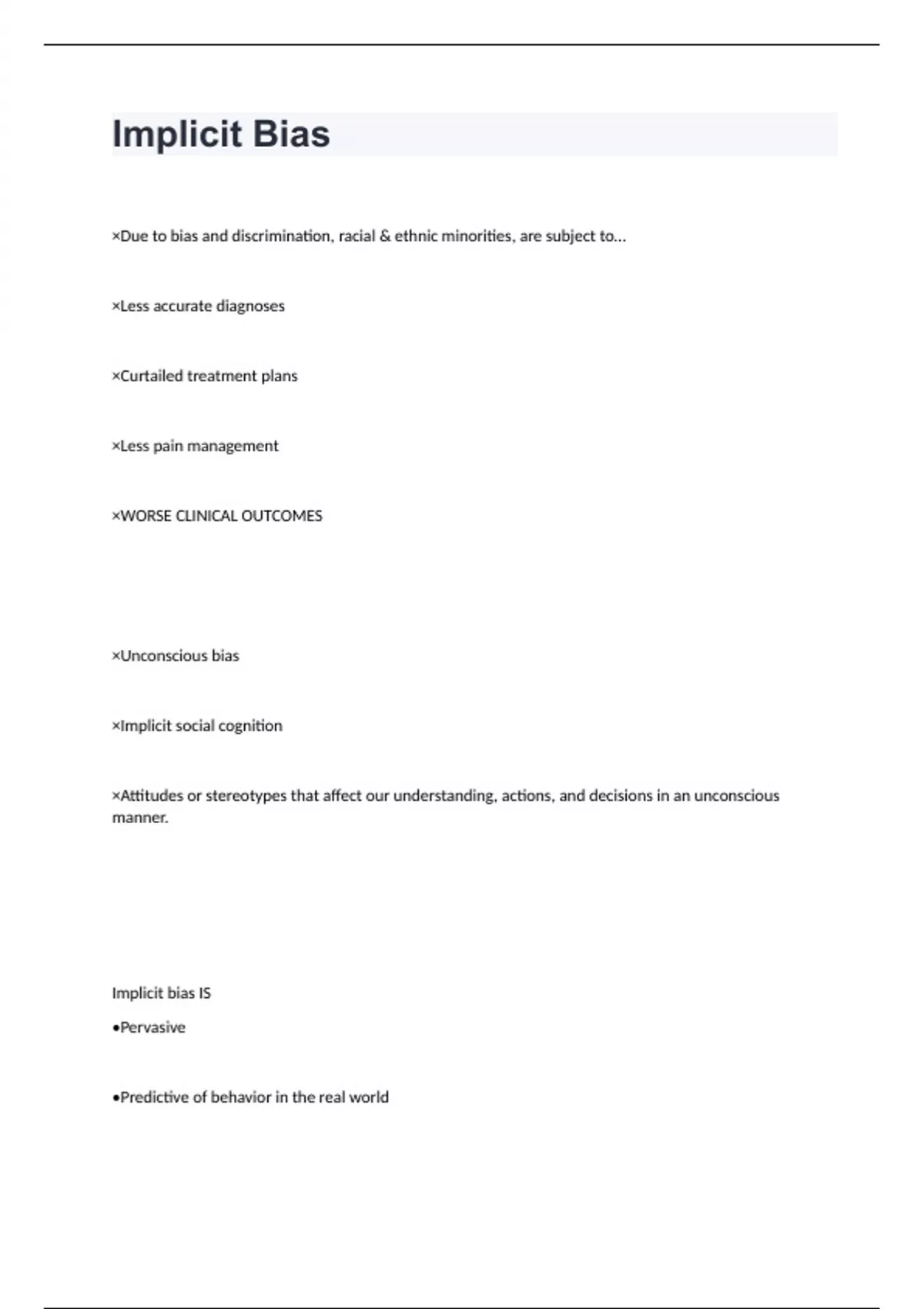Implicit Bias×Due to bias and discrimination, racial & ethnic minorities, are subject to… ×Less accurate diagnoses ×Curtailed treatment plans ×Less pain management ×WORSE CLINICAL OUTCOMES ×Unconscious bias ×Implicit social cognition ×Attitudes or stereotypes that affect our understanding, actions, and decisions in an unconscious manner. Implicit bias IS •Pervasive •Predictive of behavior in the real world