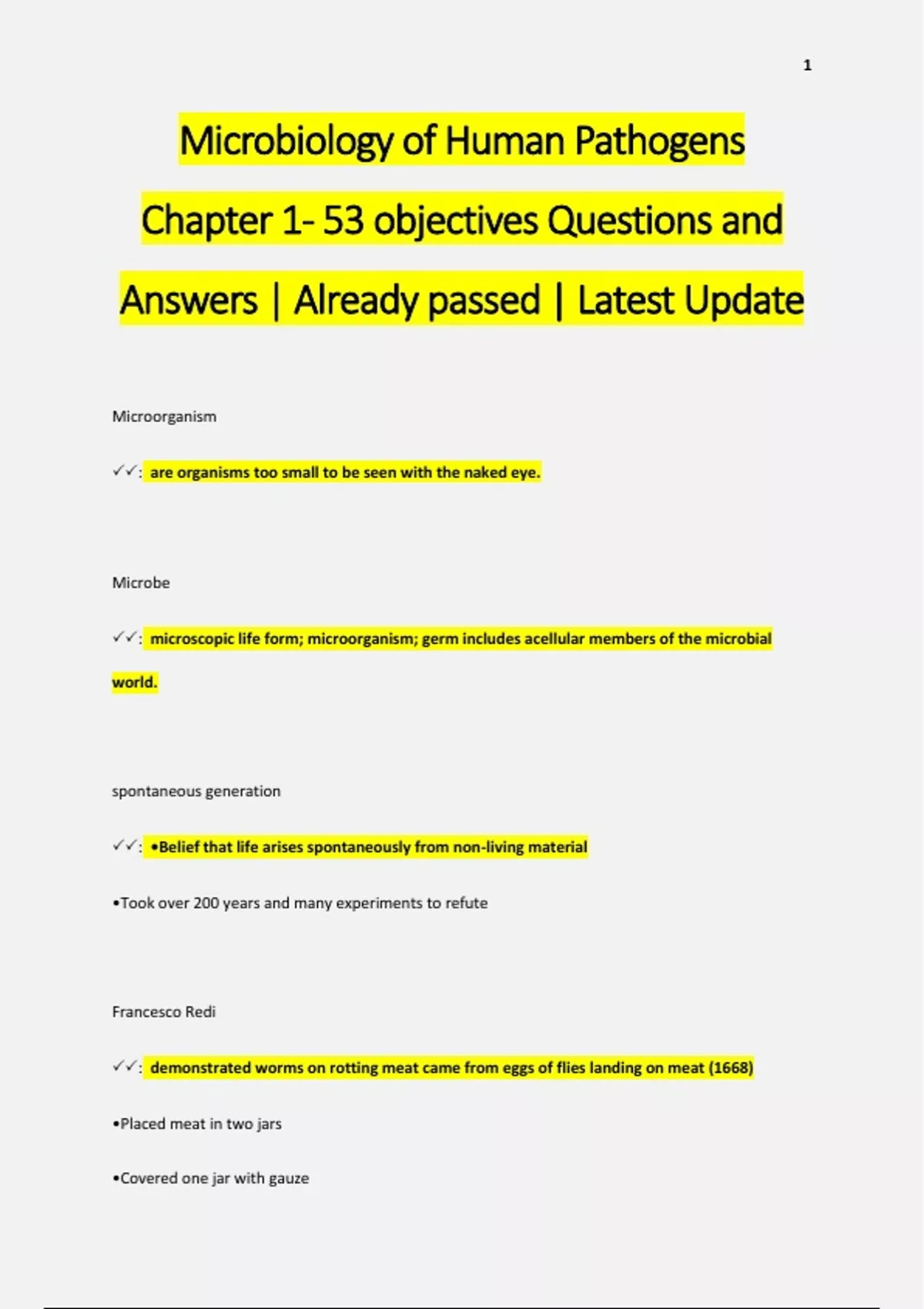 Microbiology of Human Pathogens Chapter 1- 53 objectives Questions and Answers | Already passed | Latest Update