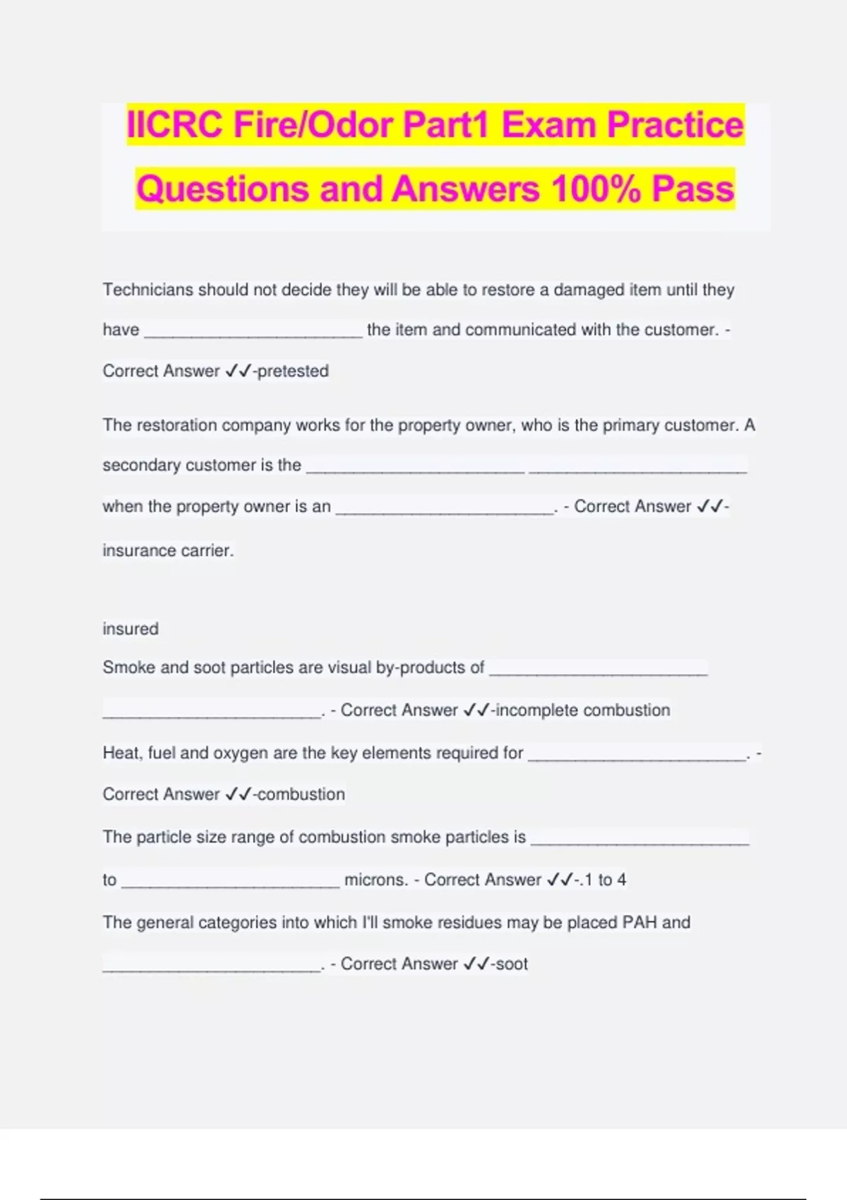 IICRC Fire/Odor Part1 Exam Practice Questions and Answers 100% Pass Technicians should not decide they will be able to restore a damaged item until they have _______________________ the item and communicated with the customer. - Correct Answer ️️ -pretested The restoration company works for the property owner, who is the primary customer. A secondary customer is the _______________________ _______________________ when the property owner is an _______________________. - Correct Answer ️️ - insurance carrier. insured Smoke and soot particles are visual by-products of _______________________ _______________________. - Correct Answer ️️ -incomplete combustion Heat, fuel and oxygen are the key elements required for _______________________. - Correct Answer ️️ -combustion The particle size range of combustion smoke particles is _______________________ to _______________________ microns. - Correct Answer ️️ -.1 to 4 The general categories into which I'll smoke residues may be placed PAH and _______________________. - Correct Answer ️️ -soot Both PAH and particles have been reported to be _______________________ to humans. - Correct Answer ️️ -carcinogenic A very difficult smoke odor for technicians to overcome is the _______________________ _______________________ order, also called "psychological" odor. - Correct Answer ️️ -heightened awareness To remove high levels of protein odor from surfaces, _______________________ _______________________ is usually required for cleaning protein residues. - Correct Answer ️️ -wet cleaning When burned, this material will produce a thick, heavy blacks smeary residue. _______________________ - Correct Answer ️️ -synthetic Factors to consider in determining the degree of smoke contamination throughout a structure are the air _______________________ and _______________________ generated during combustion. - Correct Answer ️️ -pressures; combustion The severity of soot contamination increases with a _______________________ of oxygen and decreases when a _______________________ _______________________ of oxygen is present during the fire. - Correct Answer ️️ - lack; greater quantity Some materials and surfaces naturally absorb more odors than others. The odor control industry refers to them as " _______________________ _______________________". - Correct Answer ️️ -natural wicks During a fire, smoke can carry vaporized oils, which eventually settle to leave an _______________________ _______________________on surfaces. - Correct Answer ️️ -oily film Lighter plastic surfaces subjected to higher temperatures and soot have potential to _______________________ irreversibly. - Correct Answer ️️ -yellow From a common sense perspective, safety on the job site is the resp