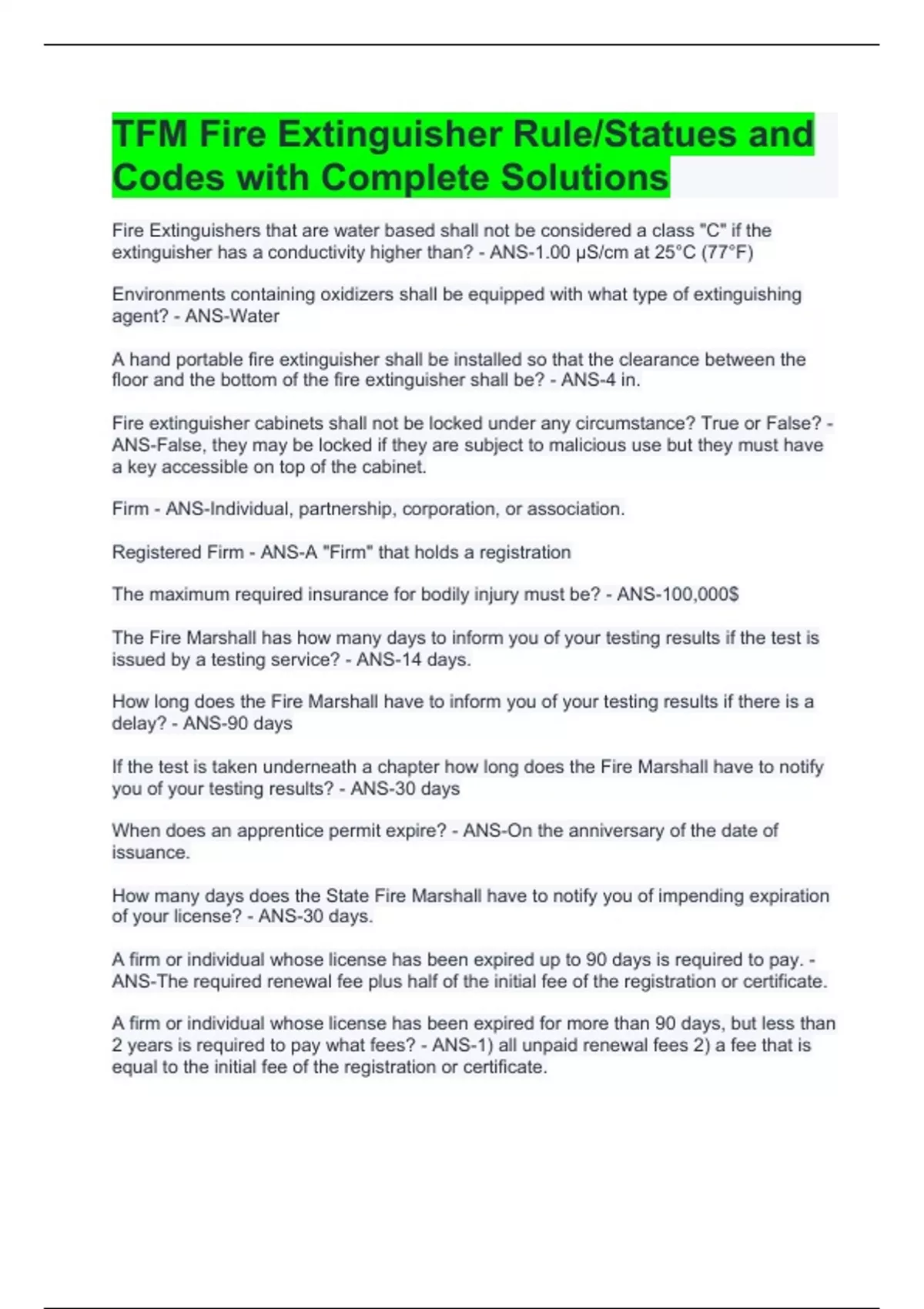TFM Fire Extinguisher Rule/Statues and Codes with Complete Solutions