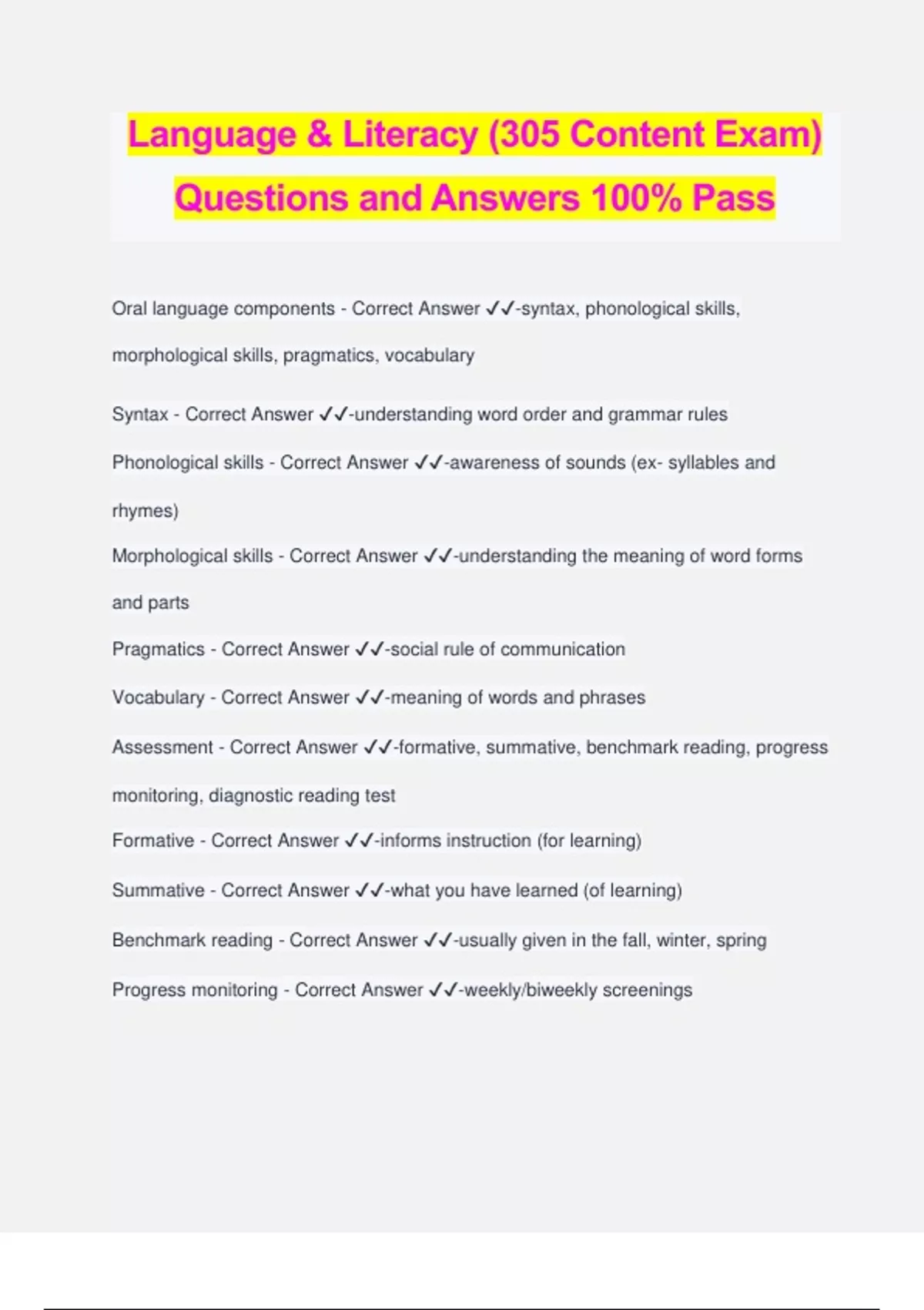 Language & Literacy (305 Content Exam) Questions and Answers 100% Pass Oral language components - Correct Answer ️️ -syntax, phonological skills, morphological skills, pragmatics, vocabulary Syntax - Correct Answer ️️ -understanding word order and grammar rules Phonological skills - Correct Answer ️️ -awareness of sounds (ex- syllables and rhymes) Morphological skills - Correct Answer ️️ -understanding the meaning of word forms and parts Pragmatics - Correct Answer ️️ -social rule of communication Vocabulary - Correct Answer ️️ -meaning of words and phrases Assessment - Correct Answer ️️ -formative, summative, benchmark reading, progress monitoring, diagnostic reading test Formative - Correct Answer ️️ -informs instruction (for learning) Summative - Correct Answer ️️ -what you have learned (of learning) Benchmark reading - Correct Answer ️️ -usually given in the fall, winter, spring Progress monitoring - Correct Answer ️️ -weekly/biweekly screenings Diagnostic Reading test - Correct Answer ️️ -individual students specific areas of weakness, use the results to inform instruction, used after progress monitoring, pre- intervention step Reading levels - Correct Answer ️️ -independent, instructional, frustration Independent level - Correct Answer ️️ -97-100% accuracy; fluent reading; 90-100% comprehension Instructional level - Correct Answer ️️ -90-96% accuracy; somewhat fluent; 75-90% comprehension Frustration level - Correct Answer ️️ -< 90% accuracy; may/may not be fluent; comprehension low Phonological Awareness - Correct Answer ️️ -Awareness of the words, syllables, rhymes, and sounds in language. (Words in sentences) Syllables - Correct Answer ️️ -a unit of pronunciation having one vowel sound, with or without surrounding consonants. (Ze-bra; 2 syllables- 1 open syllable and 1 closed syllable) Open syllable - Correct Answer ️️ -ends with a long vowel sound spel