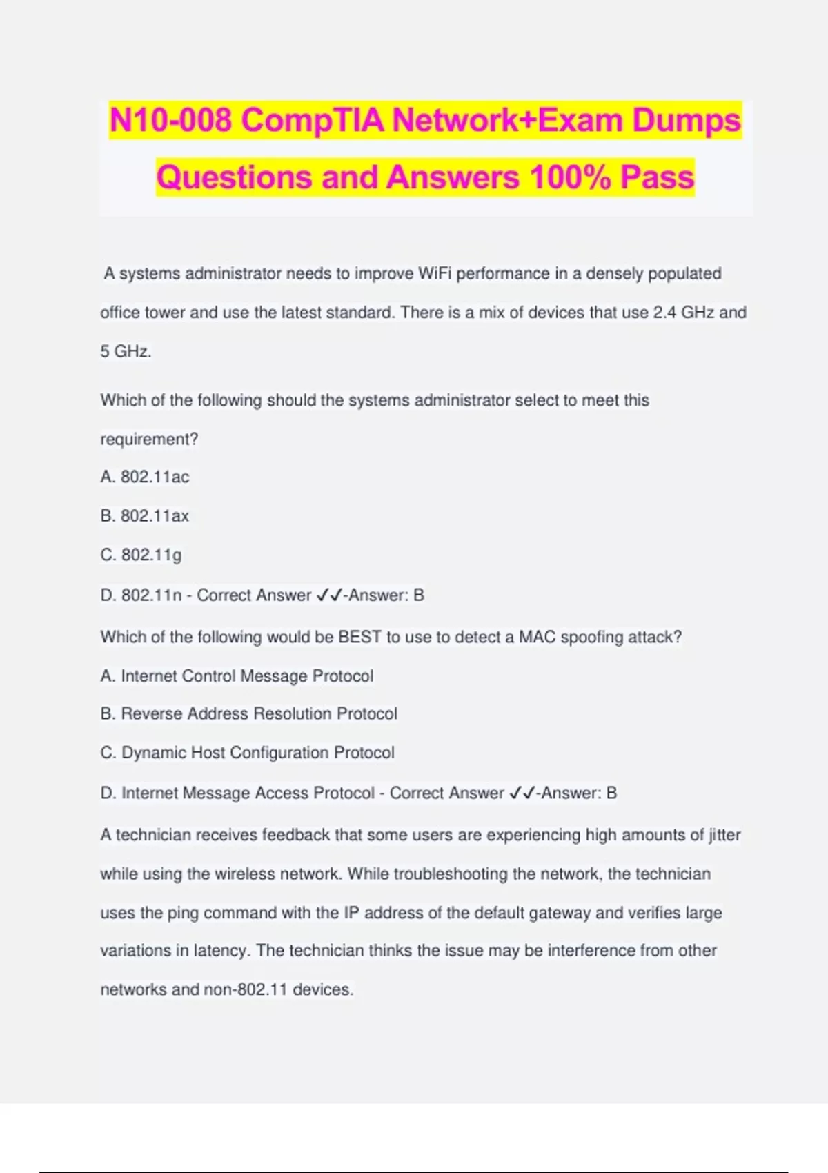 N10-008 CompTIA Network+Exam Dumps Questions and Answers 100% Pass A systems administrator needs to improve WiFi performance in a densely populated office tower and use the latest standard. There is a mix of devices that use 2.4 GHz and 5 GHz. Which of the following should the systems administrator select to meet this requirement? A. 802.11ac B. 802.11ax C. 802.11g D. 802.11n - Correct Answer ️️ -Answer: B Which of the following would be BEST to use to detect a MAC spoofing attack? A. Internet Control Message Protocol B. Reverse Address Resolution Protocol C. Dynamic Host Configuration Protocol D. Internet Message Access Protocol - Correct Answer ️️ -Answer: B A technician receives feedback that some users are experiencing high amounts of jitter while using the wireless network. While troubleshooting the network, the technician uses the ping command with the IP address of the default gateway and verifies large variations in latency. The technician thinks the issue may be interference from other networks and non-802.11 devices. Which of the following tools should the technician use to troubleshoot the issue? A. NetFlow analyzer B. Bandwidth analyzer C. Protocol analyzer D. Spectrum analyzer - Correct Answer ️️ -Answer: D Wireless users are reporting intermittent internet connectivity. Connectivity is restored when the users disconnect and reconnect, utilizing the web authentication process each time. The network administrator can see the devices connected to the APs at all times. Which of the following steps will MOST likely determine the cause of the issue? A. Verify the session time-out configuration on the captive portal settings B. Check for encryption protocol mismatch on the client's wireless settings C. Confirm that a valid passphrase is being used during the web authentication D. Investigate for a client's disassociation caused by an evil twin AP - Correct Answer ️️ -Answer: A A network administrator walks into a datacenter and notices an unknown person is following closely. The administrator stops and directs the person to the security desk. Which of the following attacks did the network administrator prevent