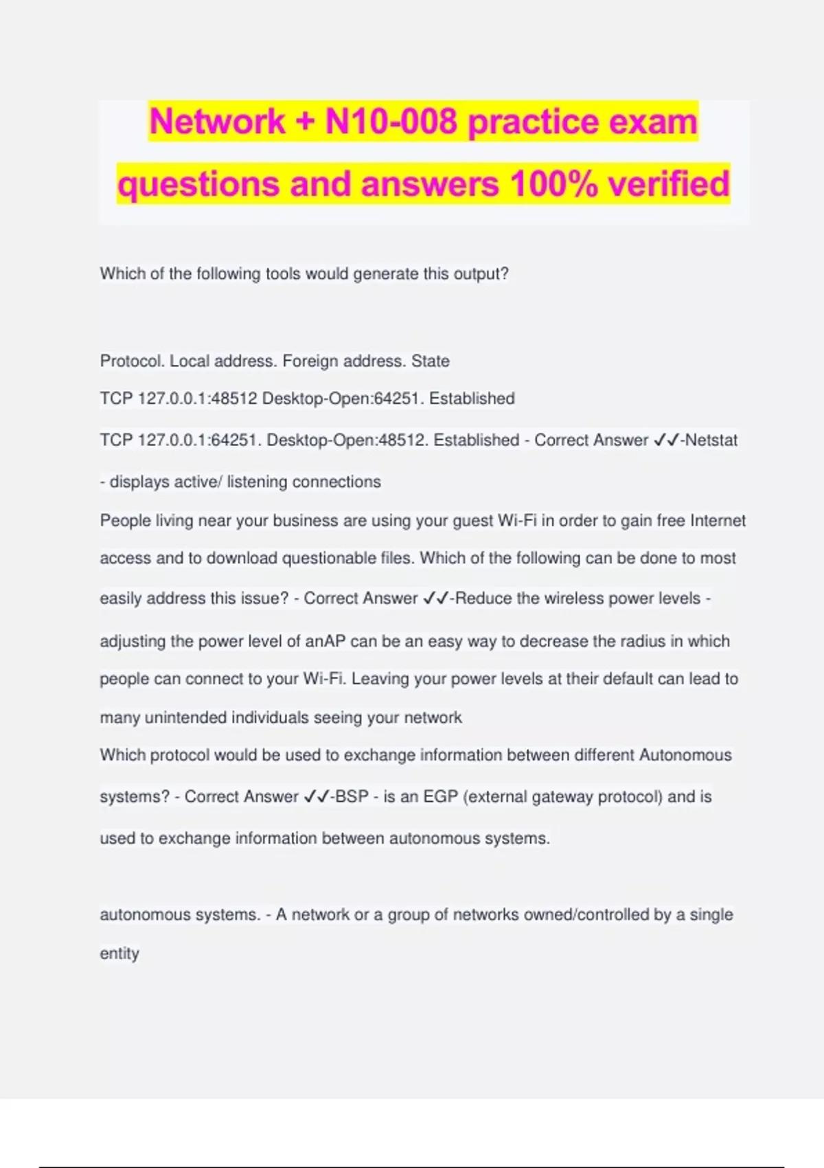 Network + N10-008 practice exam questions and answers 100% verified Which of the following tools would generate this output? Protocol. Local address. Foreign address. State TCP 127.0.0.1:48512 Desktop-Open:64251. Established TCP 127.0.0.1:64251. Desktop-Open:48512. Established - Correct Answer ️️ -Netstat - displays active/ listening connections People living near your business are using your guest Wi-Fi in order to gain free Internet access and to download questionable files. Which of the following can be done to most easily address this issue? - Correct Answer ️️ -Reduce the wireless power levels - adjusting the power level of anAP can be an easy way to decrease the radius in which people can connect to your Wi-Fi. Leaving your power levels at their default can lead to many unintended individuals seeing your network Which protocol would be used to exchange information between different Autonomous systems? - Correct Answer ️️ -BSP - is an EGP (external gateway protocol) and is used to exchange information between autonomous systems. autonomous systems. - A network or a group of networks owned/controlled by a single entity Which of the following controls could be used to allow employees entry into building to be recorded by a card reader? - Correct Answer ️️ -Access control vestibules - physical or logical list of who entered a room/building. This could be a sign in sheet or even a complex system that reads RFID cards and records who enters/leaves in area electronically Which of the following can be used to centrally manage credentials for various accounts or privilege levels on network devices? - Correct Answer ️️ -TACACS+ While troubleshooting a network you notice a connection reporting Late collisions over a half duplex link. You verify that both ends of the device are indeed running half duplex interfaces. Given that information which of the following answers is the most likely cause of this scenario? - Correct Answer ️️ -The cable length is excessive - whenever you see lake collisions that is a telltale sign that your cable is running past its maximum recommended length for example twisted-pair cables shouldn't be run further than 100 m ( 328ft) While configuring a load balancer between multiple systems which of the following must be configured in order to ensure proper connectivity during a fail over? - Correct Answer ️️ -VIP - virtual IP an essential part of configuring load balance systems as a single system Which of the following service models would most likely be used to replace on premises servers with a could solution - Correct Answer ️️ -IaaS - client moves whole infrastructure to the cloud minus the hardware of course which is always controlled by the CSP in cloud deployments Which of the following best mitigate a hackers frequent attempts at brute forceing A company's password - Correct Answer ️️ -Two factor authentication, complex passwords. — passwords are best protected with longer, more complex passwords preferably pass phrases made up of multiple words. Additionally some form of MFA is considered essential today for "password security". Multi factor authentication protects your password by preventing it from being a single point of failure now we should require another factor in addition to our password such as using a biometrics or a smart card After configuring new firewalls with the correct configuration to be deployed to each remote branch, unneeded services were disabled, and all firewalls rules were applied successfully. Which of the following actions should be performed next to finish hardening the firewalls? - Correct Answer ️️ -Update the firewalls with current firmware and software — Keeping a device up today is an essential step in hardening any system Which of the following solutions would allow for high speed, low latency, and globally disperse content distribution? - Correct Answer ️️ -Public cloud — CDNs or content delivery networks are load balance networks that are geographically separated in order to provide the best connection for local users while also providing normal load balancing services. This is just the idea of having many servers all around the world to serve many people A new network was set up in order to facilitate more users in a building near your companies HQ. The new network is connected to the HQ's LAN via a fiber optic cable. However many users on the new network are unable to access the companies Intranet despise being able to access the Internet. Which of the following corrections would most likely resolve this issue? - Correct Answer ️️ -Correct the external firewall gateway address — Could be a misconfigured firewall Which of the following attacks consists of following close
