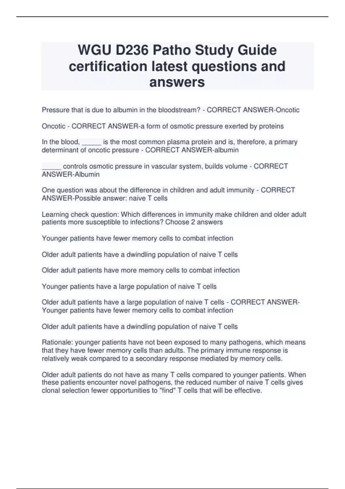 WGU D236 Patho Study Guide certification latest questions and answers Pressure that is due to albumin in the bloodstream? - CORRECT ANSWER-Oncotic Oncotic - CORRECT ANSWER-a form of osmotic pressure exerted by proteins In the blood, _____ is the most common plasma protein and is, therefore, a primary determinant of oncotic pressure - CORRECT ANSWER-albumin _____ controls osmotic pressure in vascular system, builds volume - CORRECT ANSWER-Albumin One question was about the difference in children and adult immunity - CORRECT ANSWER-Possible answer: naive T cells Learning check question: Which differences in immunity make children and older adult patients more susceptible to infections? Choose 2 answers Younger patients have fewer memory cells to combat infection Older adult patients have a dwindling population of naive T cells Older adult patients have more memory cells to combat infection Younger patients have a large population of naive T cells Older adult patients have a large population of naive T cells - CORRECT ANSWERYounger patients have fewer memory cells to combat infection Older adult patients have a dwindling population of naive T cells Rationale: younger patients have not been exposed to many pathogens, which means that they have fewer memory cells than adults. The primary immune response is relatively weak compared to a secondary response mediated by memory cells. Older adult patients do not have as many T cells compared to younger patients. When these patients encounter novel pathogens, the reduced number of naive T cells gives clonal selection fewer opportunities to "find" T cells that will be effective. Fluid and electrolyte levels are regulated by _______, which regulates actions such as thirst, ADH, the kidneys, and RAAS. - CORRECT ANSWER-osmoreceptors Fluid deficit causes - CORRECT ANSWER--E